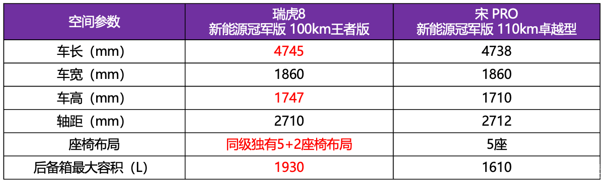 自驾春游,车辆的空间舒适性以及载物能力至关重要,它关乎这用户的身心愉悦。对比来看,在车宽同为1860mm,以及轴距相差无几的情况下,相比宋PRO新能源冠军版,瑞虎8新能源冠军版有着更长的4745mm车身长度,更高的1747mm车身高度,让实际乘坐体验更加优越,即使全部坐满乘客,他们的头部和腿部空间也都很富余,不会出现拥挤的情况发生,非常适合大家庭出行。试想一下,有瑞虎8新能源冠军版陪伴,全家人在没有任何空间束缚的情况下,沐浴春日里的暖阳,感受草木的芬芳,欣赏郊外夜空中璀璨的繁星,无疑是一件幸福而又温馨的事情。同时,瑞虎8新能源冠军版还以1930L的最大后备箱容积,在宋 Pro DM- i冠军版面前独占鳌头,彰显强大的载物能力。