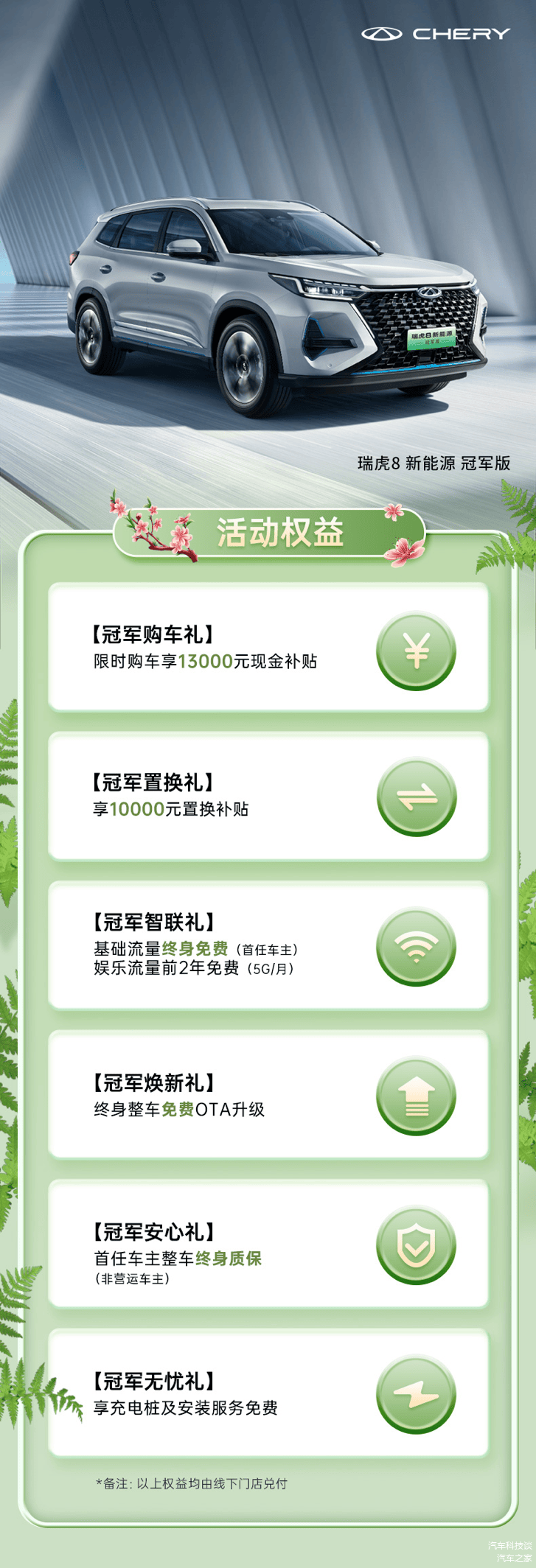 对于广大用户而言,省钱轻松无压力,是他们购车时的刚需。为此瑞虎8新能源冠军版享10000元置换补贴、限时购车13000元现金补贴、基础流量终身免费(首任车主)、娱乐流量前2年免费(5G/月)、终身整车免费OTA升级、首任车主整车终身质保(非营运车主)、充电桩及安装服务免费等超值权益,真正做到了真金白银让利。对比之下,宋PLUS新能源冠军版的4000元置换补贴、整车保修期6年或15万公里等,宋PRO新能源冠军版的10000元现金优惠、置换补贴2500元、整车保修期6年或15万公里,银河L7 MAX的首任车主(非营运)可享整车6年或15万公里质保、三电终身质保等,哈弗枭龙MAX享置换购车下订3000元抵30000 元补贴、首任车主(非营运、非公户)三电系统终身免费保修等权益,都在瑞虎8新能源冠军版面前黯然失色,贴心的力度有待进一步提高。