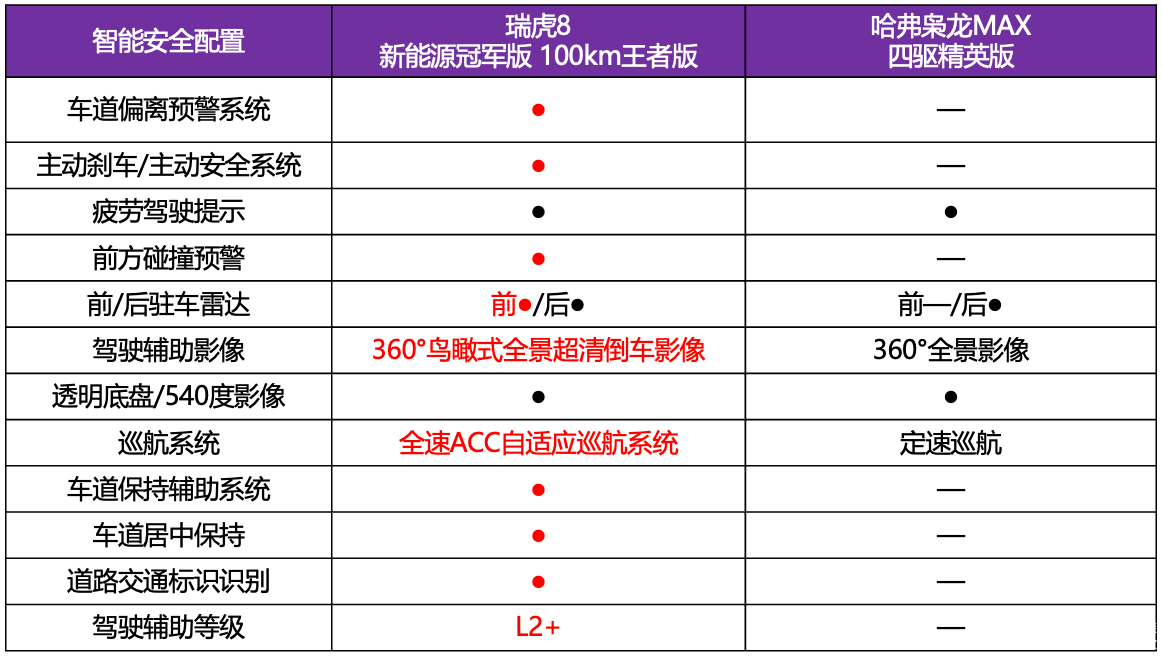 自驾春游,安全至上。从下图的对比中不难看出,在智能安全配置上,相比哈弗枭龙MAX,瑞虎8新能源冠军版多配备了车道偏离预警系统、全速ACC自适应巡航系统、360°鸟瞰式全景超清倒车影像等,让用户行车更安心更安全。当然,作为一台满足全家人出游的家庭SUV,实用性是前提,如果有一个足够好玩的多功能智能车机系统,想必能够让自驾时光充满乐趣。为此,在智能互联配置方面,瑞虎8新能源冠军版比哈弗枭龙MAX更丰富,既有快人一步的高通骁龙8155芯片,更有具备海量音乐、新闻、娱乐资讯等在线服务的雄狮智云Lion 5.0系统,无疑让用户享受全维度的便捷用车体验。