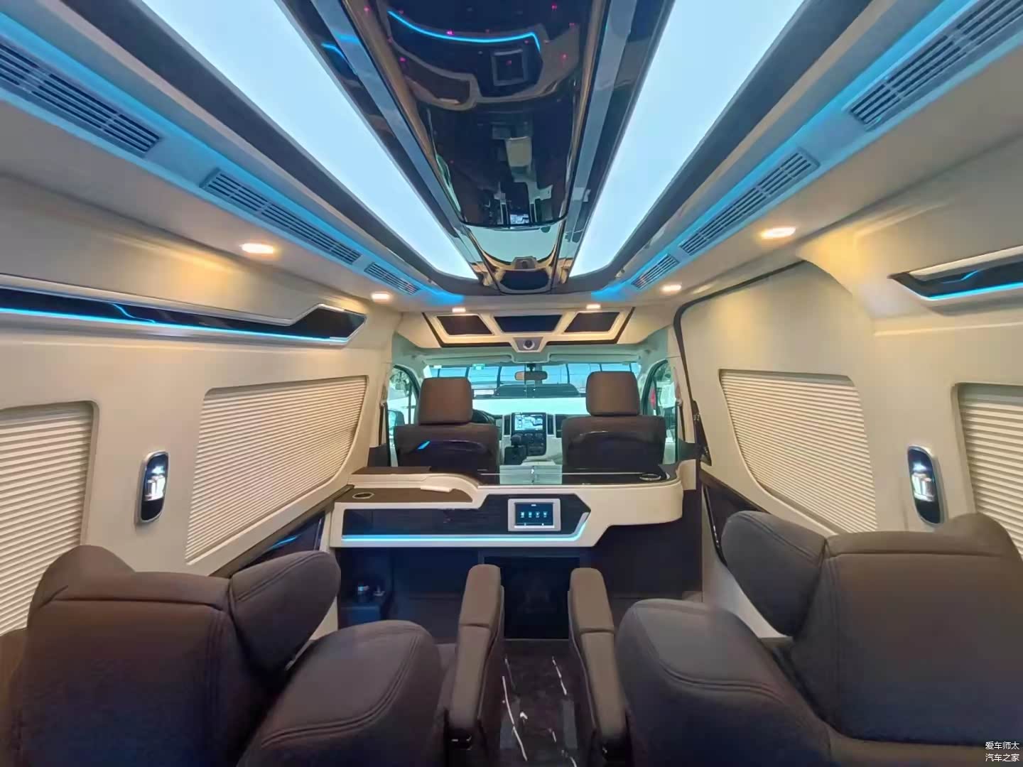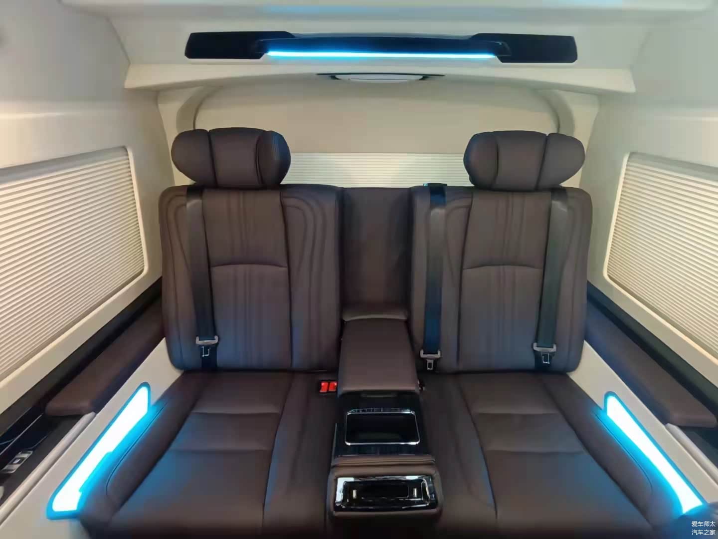 丰田海狮内饰4把航空座椅(通风,加热,按摩,电动调节后背,旋转座椅,腿托,座椅前后电动动,纳帕真皮)沙发床(纳帕皮,靠背前后电动调节,前后电动调节)侧壁窗帘造型,氛围灯,侧壁地脚线,软包,镀铬套件,C柱壁灯,220V电源USB插口,侧壁桃木。