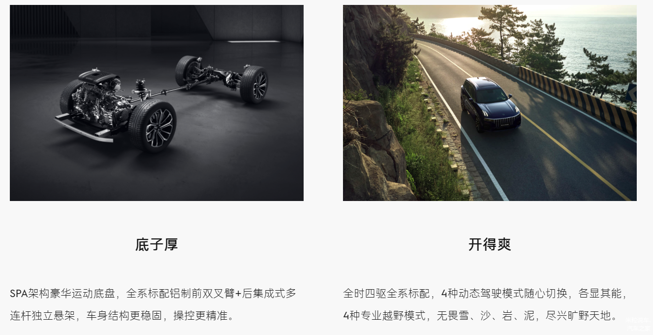 新车的优点其实是非常多的,首先是动力系统,搭载的2.0T+48V的轻混系统,匹配了八挡手自一体变速箱。更关键的是,这款领克09匹配了中央差速器,全时四驱,而且与宝马一样采用的前双叉臂独立悬架以及后多连杆独立悬架系统,操控属性以及机械素养到位,这也是我当初喜欢这款新车的主要原因。此外,新车还拥有六种驾驶模式,比如越野,雪地,动力性能强,再加上硬派四驱,能够很好的防滑。
