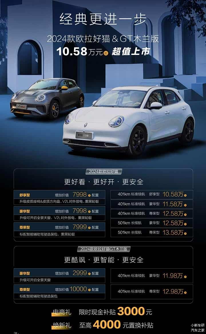 4月26日北京车展长城汽车展台欧拉品牌发布会,2024款欧拉好猫与欧拉好猫GT木兰版正式上市。其中,2024款欧拉好猫推出401km和501km两种续航里程共计五款车型,售价10.58万-13.58万元;2024款欧拉好猫GT木兰版推出两款车型,售价分别为11.98万元和12.98万元。