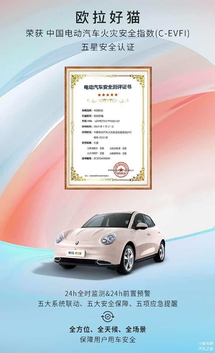 整车采用416项整车电安全防护、24小时全时监测&24小时前置预警,五大系统联动等举措,令新车获得了中国电动汽车火灾安全指数(C-EVFI)五星安全评价。