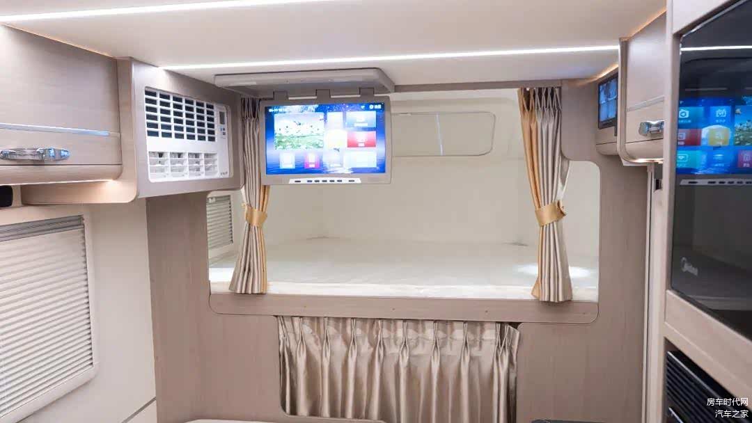 固定睡卧区位于车尾一侧,需要同前侧会客区卡座组合使用,将椅背放倒后铺上床垫,整个区域就形成了一张较大的休息床铺。床侧配有阅读灯、电源接口等便利性设施,符合用户的使用习惯。顶部为储物吊柜设计,便于用户收纳生活衣物。床铺下方配置了一台3kg洗衣机,为用户旅居时清洗衣物提供便利。