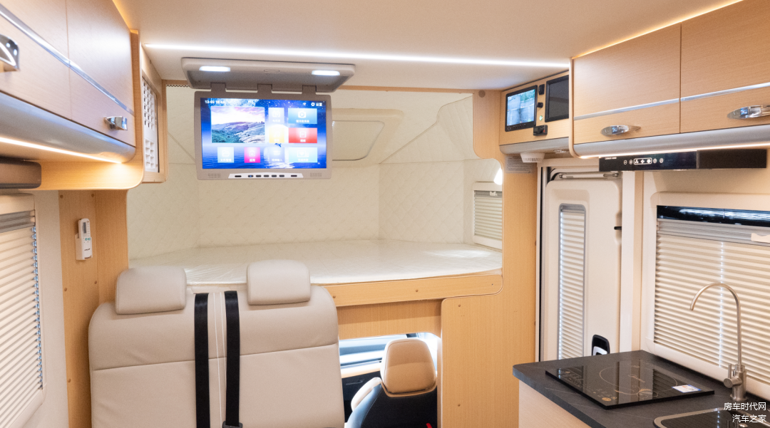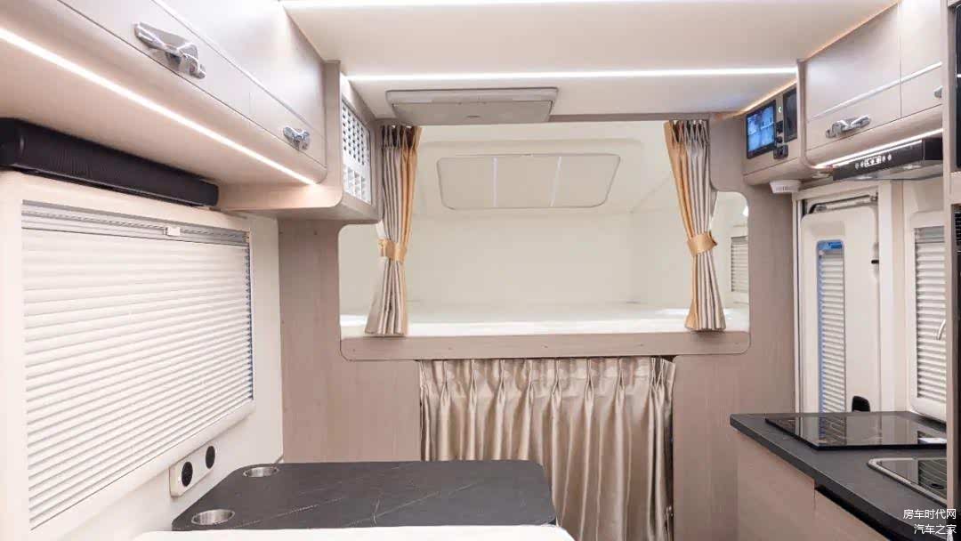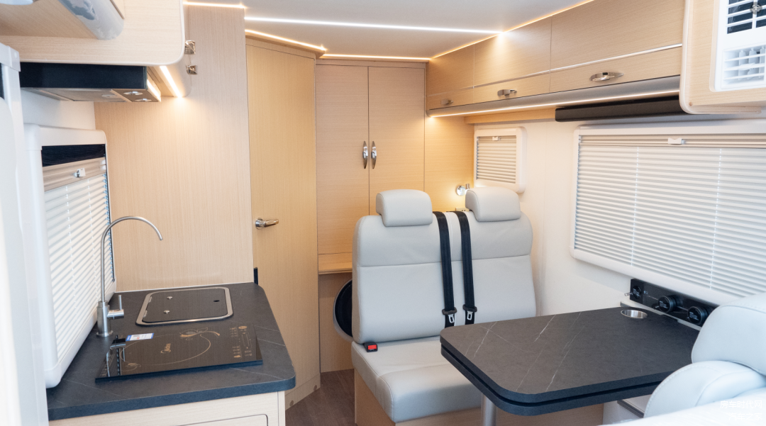 中门旁侧为厨房区,台面内嵌有电磁炉、洗菜池,上方装有抽油烟机,并且操作台前侧设计了一个较大的外推窗,可以在用户制餐时帮助通风换气。橱台侧面设计有拓展岩板,可临时增加台面的操作面积;此外,车内还配置了微波炉、直饮水系统以及一台148L冰箱,大大提升了用户旅居的便利。