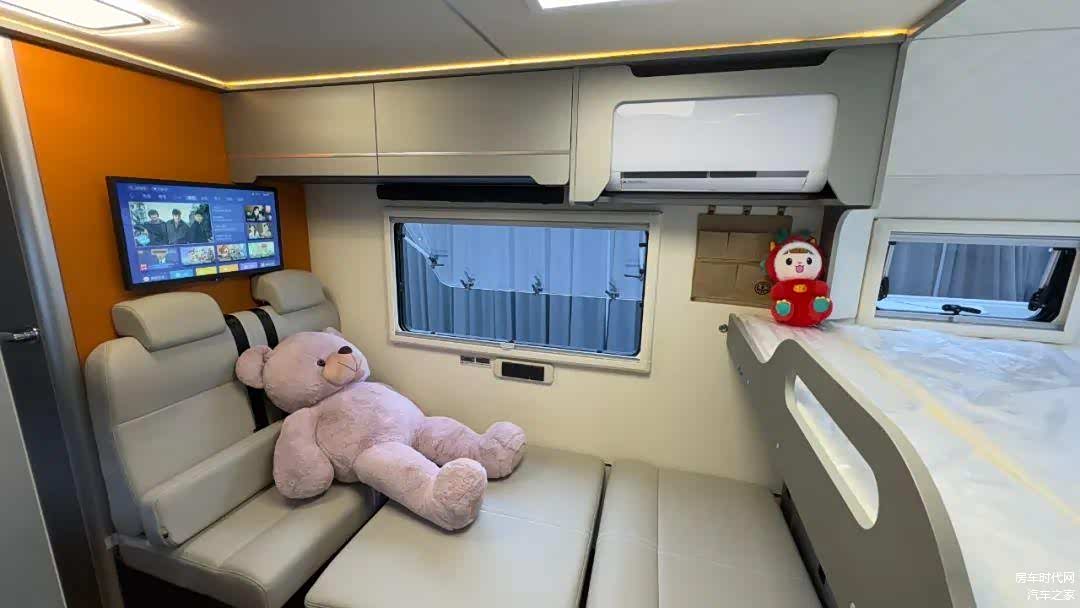 车厢中部为会客区,采用了对卡座+气动升降桌布局,卡座旁侧设计有电源接口、杯槽、灯带等便利性设施,符合用户日常的使用习惯。卡座上方设有一台空调,帮助用户调节车内温度。影视娱乐方面,车内配置了一台22寸吸顶电视,匹配有品牌音箱,用户坐在会客区即可舒适观看。