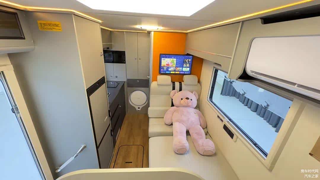 生活区布局合理,功能齐全又不显拥挤。内饰风格以原木色为主,生活区为无主灯设计,配置了丰富的氛围灯带,保障用户全时段的采光需求。