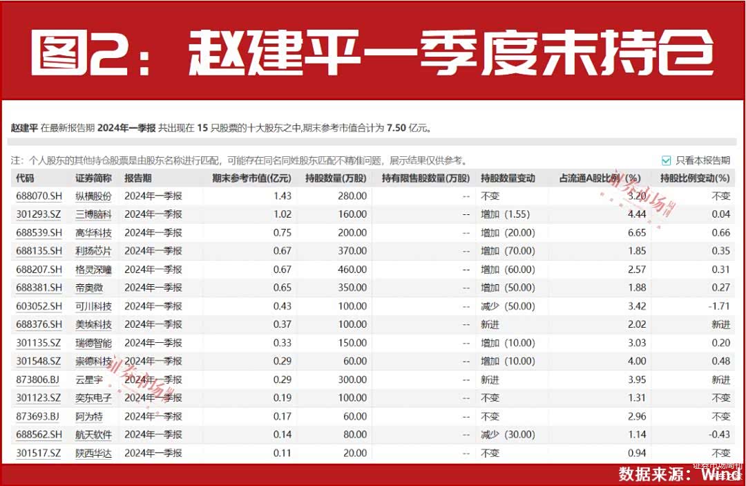 素有牛散“常青树”称号的赵建平,一季度也批量重仓了多只科技类公司,如芯片概念股高华科技、人脑工程概念股三博脑科、算力概念股陕西华达等(见图2)。