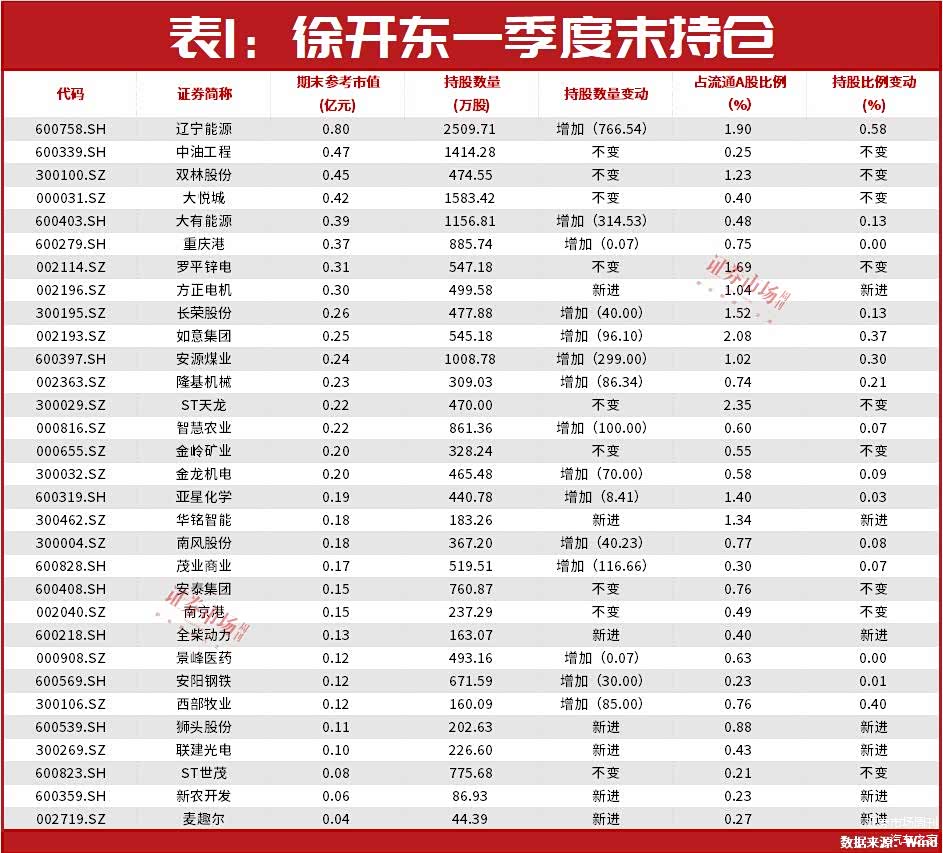 于31家公司前十大流通股东阵营现身的徐开东,新进重仓了7家公司,继续增持了15家公司,其余公司持股均与去年四季度末持平。