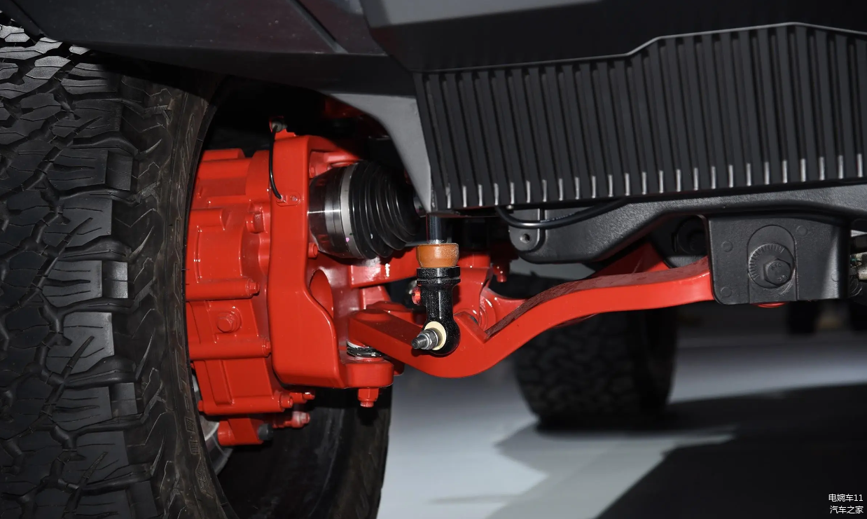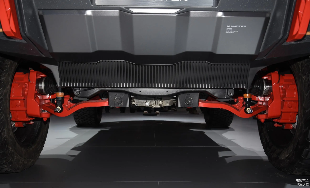 这辆猛士狩猎者使用的是和猛士917比较接近的动力系统,大概率是增程版本车型,参考猛士917,最大功率应该在600千瓦左右,峰值扭矩1050牛米,电池组具备200公里的纯电续航里程。狩猎者的最大亮点在于它的底盘系统,是一辆高强度原厂改装的超级越野车,它使用了来自猛士军用版本以及顶级越野车所使用的门式车桥以及轮边减速器。门式车桥大幅度提高离地间隙,据称其最小离地间隙高达425毫米,相当于普通车型的两倍以上。而且由于门市车桥的存在,电池包的离地间隙达到了半米,这也就意味着对于越野影响最大的电池包将受到足够多的保护。不仅如此,可以断开的防倾杆可以继续增加90毫米的悬挂行程,如履平地。