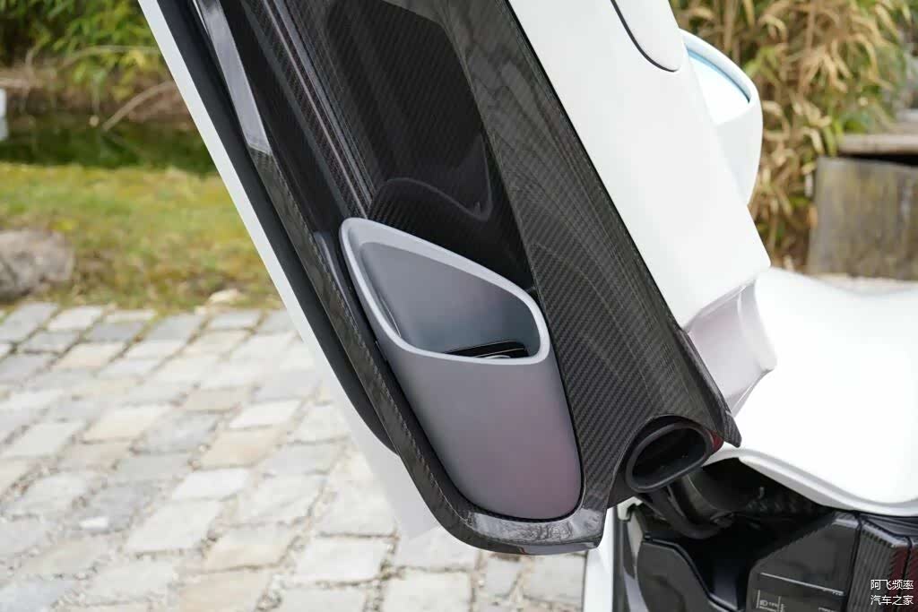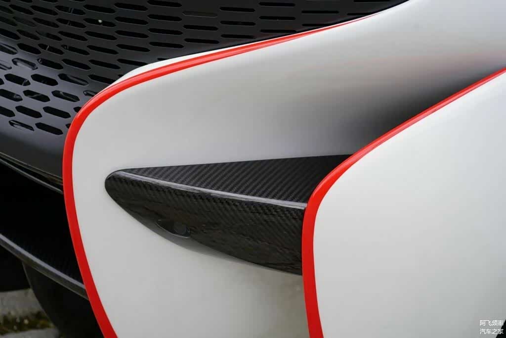 该车的外观选配了与众不同的亮白色金属漆,同时在侧面和后饰板上选择了鲜艳的红色,二者搭配在一起形成了鲜明的对比。仔细观察你会发现,这辆车的外观拥有很多裸露的碳纤维。