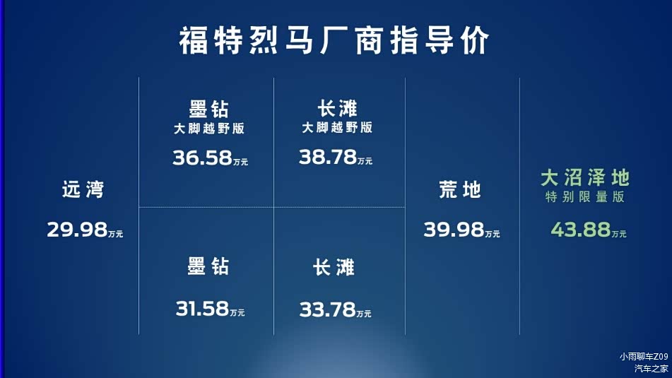 福特烈马推出了七款独具特色的车型,包括远湾、墨钻、墨钻大脚越野版、长滩、长滩大脚越野版、荒地以及大沼泽地特别限量版,每款车型都展现了福特烈马独特的魅力和实力。