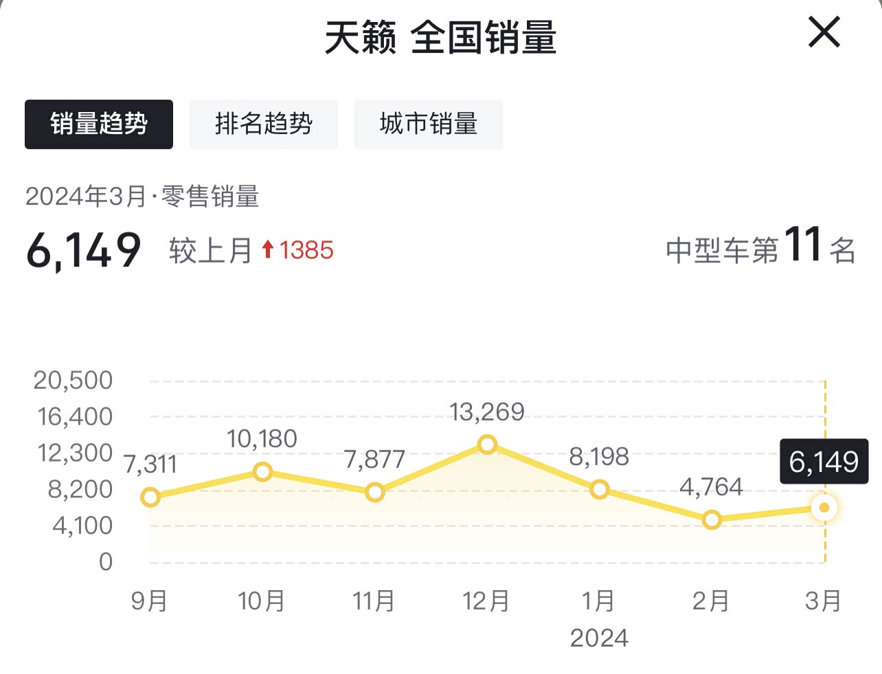 裸车不到13万,落地不到15万, 日产天籁(图片 | 参数 | 询价)的价格马上就快和别克君威看齐了!三月份,天籁卖了6149辆,近半年来,月销量一直都在大几千至万台左右徘徊。雅阁换代后销量大跌,凯美瑞换代后销量也下滑不少,如果说是因为这两款车外观越改越丑,销量才不行的。可天籁这几年外观内饰却没什么大变化呀。以不变应万变,看来这条路看来也是走不通的!