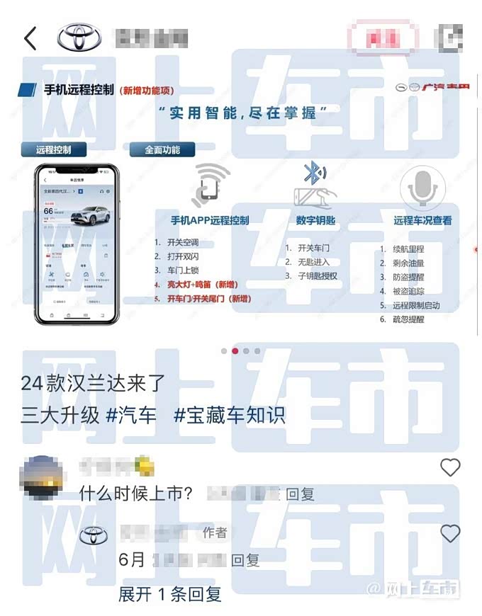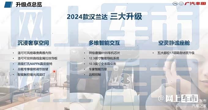 网上车市从广汽丰田经销店处获悉,2024款 汉兰达(图片 | 参数 | 询价)即将到店,预计6月上市。新车针对配置进行调整,包含空间、智能和静谧性3大升级,并未采用海外版全新设计。车内配有金属拉丝饰板、打孔NAPPA真皮座椅、总裁专属座椅调节按键、智能触控暖光阅读灯、8155车机芯片、双12.3英寸液晶大屏以及静谧座舱等配置。