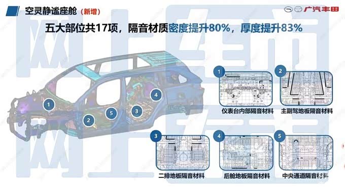 新款车内针对仪表台内部、主副驾地板、二排地板、后舱地板和中央通道等五大部位共17项隔音材质进行升级,密度提升80%,厚度提升83%,静谧性提升。双擎混动版将搭载2.5L油电混动系统,系统输出功率181kW,匹配E-CVT无级变速箱。