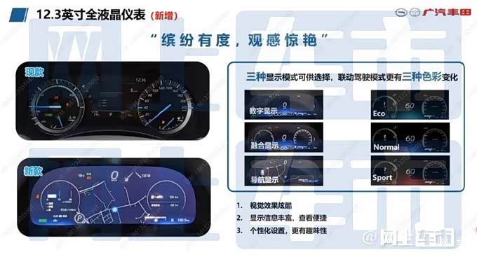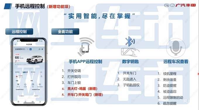 2024款汉兰达将新增12.3英寸全液晶仪表,提供3种显示模式,联动驾驶模式带来不同色彩变化,支持个性化设置,显示信息更丰富。此外还新增手机远程控制,可实现开关空调、打开双闪、车门上锁、亮大灯+鸣笛和开车门/开关尾灯功能;还能实时查看车况状态,如续航里程、剩余油量、疏忽提示等,便利性更强。