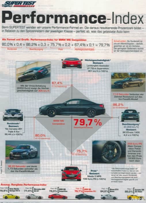 比如下图测试小改款后的M6 Competition,圈速96.2秒,相比于最快圈速Tikt改装克尔维特ZR1的88.44秒,经过计算得分80%(左);0-200加速11.6秒,相比于测过的最快的9ff改装的1400马力保时捷6.2秒,经过计算得分86.2%(右);马力价格比就是用价格除以马力得出的数值,258欧元每马力,相比于最便宜的上一代马自达3 MPS 109欧/匹,得分75.7%(下);最高时速305km/h,相比于测过最快的兰博基尼Aventador LP750的351km/h,经过计算得分67.4%(上)。M6 Competition最终得分为80%×40%+86.2×30%+75.7%×20%+67.4%×10%=79.7%,目前在Autobild Sports Cars排名第51,排名第一的是雪佛兰克尔维特 Z06 Z07-Packet,88%。