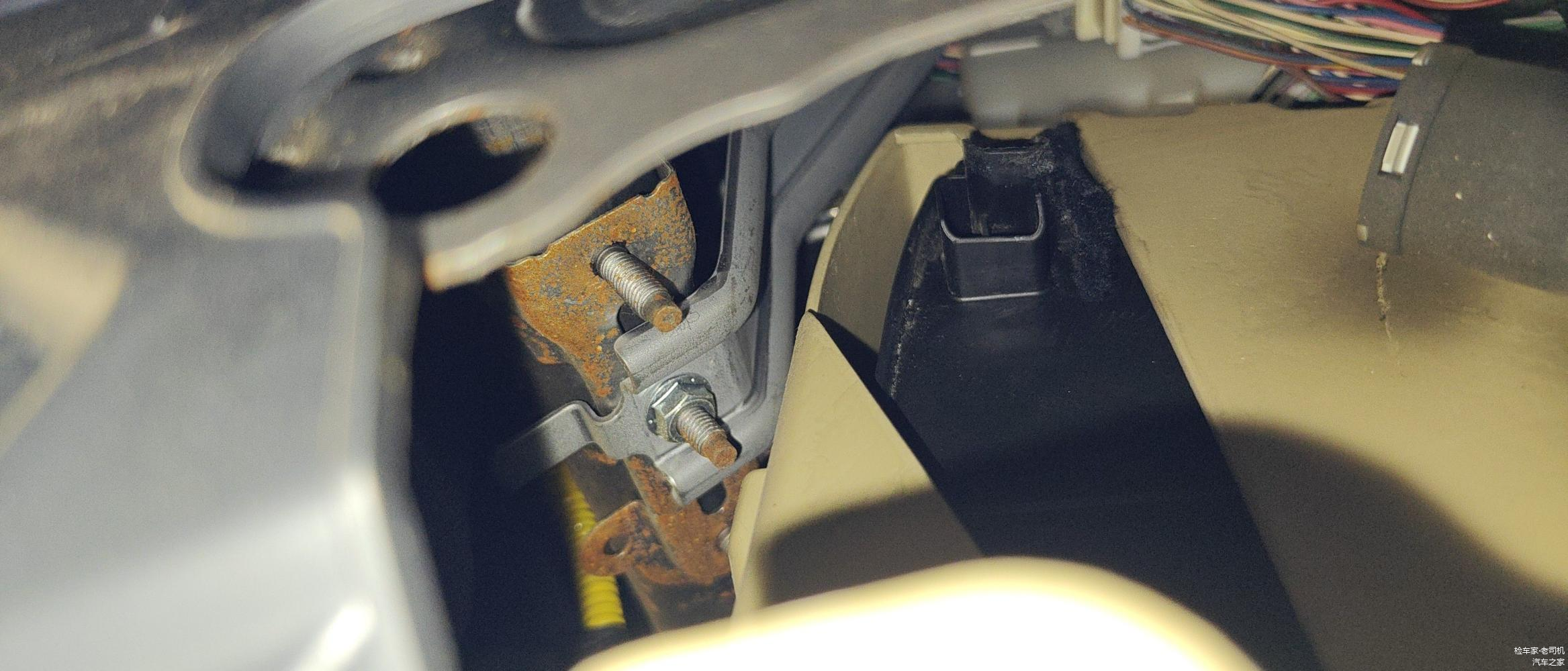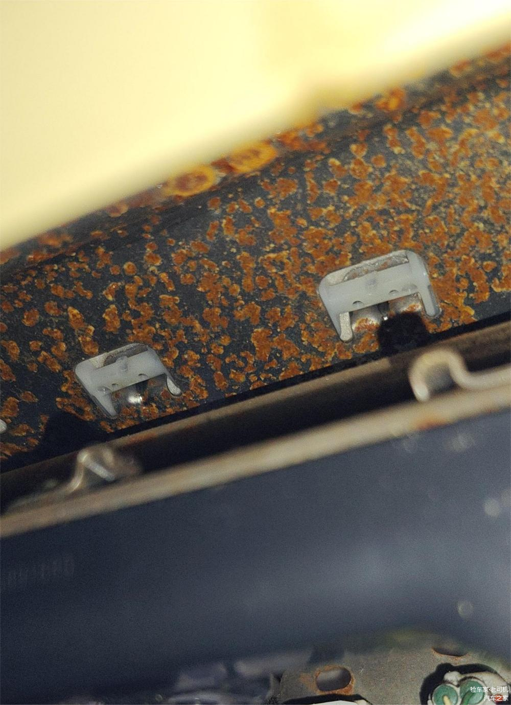 惊喜来了,主副驾驶的地毯下面有水,但是后排座椅地毯下面没有,那么有可能是车商清洗翻新内饰留下的水,还没有干;但更大的可能是天窗漏水,仪表台骨架和座椅骨架的生锈与此有关。
