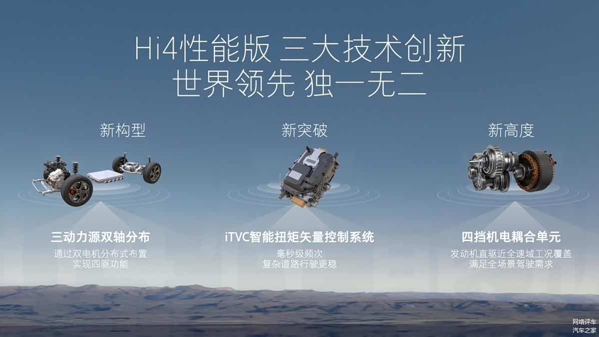 作为世界领先的四挡电四驱电混技术,Hi4性能版实现了新构型、新突破和新高度的三大技术创新与颠覆。区别于主流的双电机构型,Hi4性能版采用三动力源双轴分布,通过双电机分布式布置,实现了串并联四驱的电混架构,进一步拓宽用户出行场景;首创的iTVC智能扭矩矢量控制系统,通过毫秒级频次的扭矩调节,有效抑制低附着路面打滑,以及过弯时转向不足或转向过度,提升复杂路面操控稳定性和驾驶安全性;Hi4性能版创新设计的四挡机电耦合单元,还能使发动机直驱近全速域的工况覆盖,满足用户全场景的驾驶需求。