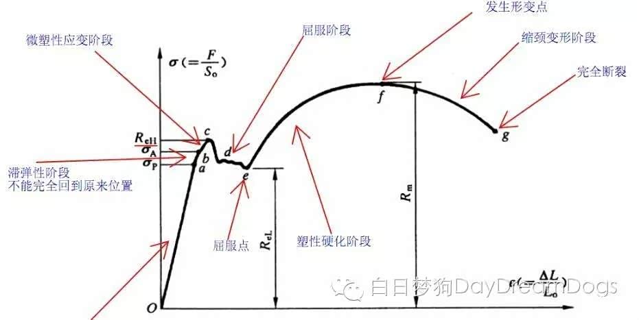 用一张典型低碳钢应变图来看,Reh就是我们刚刚提到的上屈服点。简单的说,就是变软前最硬的那一秒(捂脸)。为什么考察这个参数呢,我个人理解为在这个点之前材料依然保有一定的强度和形状,勉强还能继续用,而一旦超过这个点,那就是强撸灰飞烟灭了,会产生永久不可逆的严重变形和结构破坏。