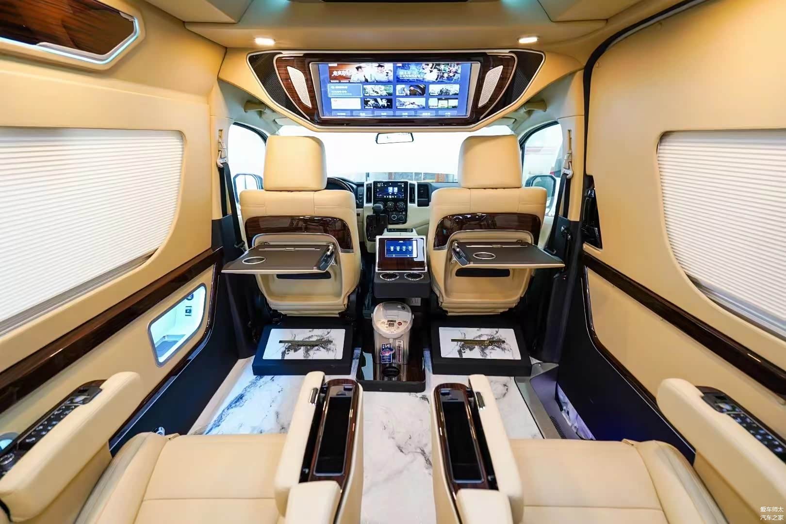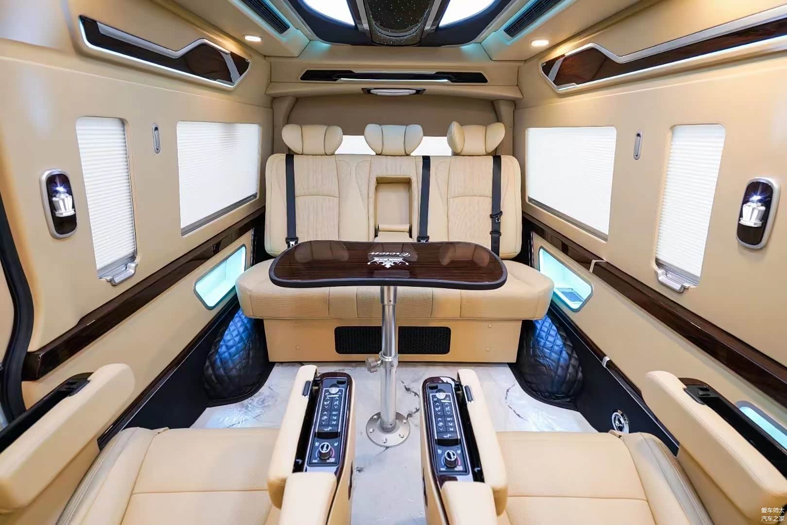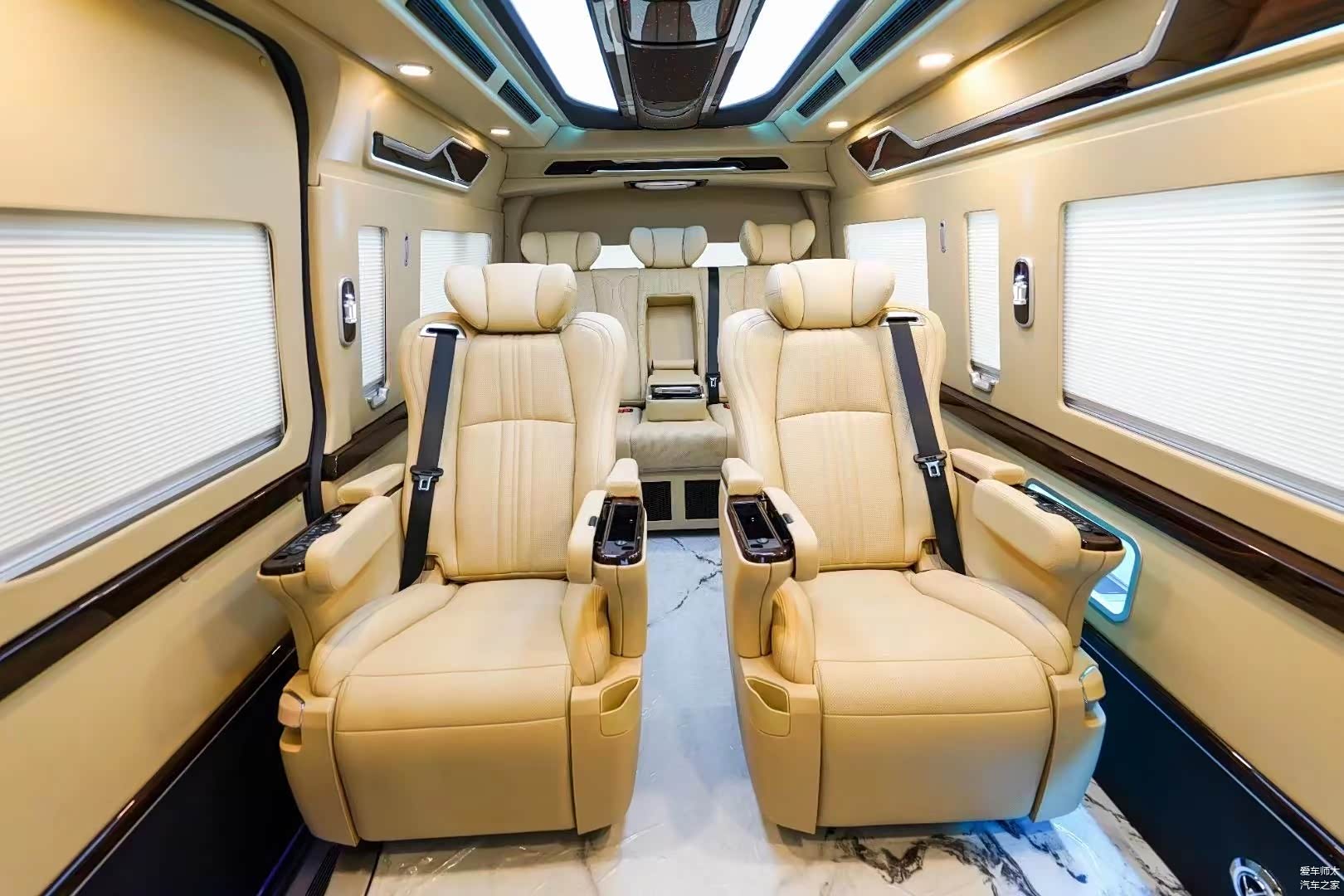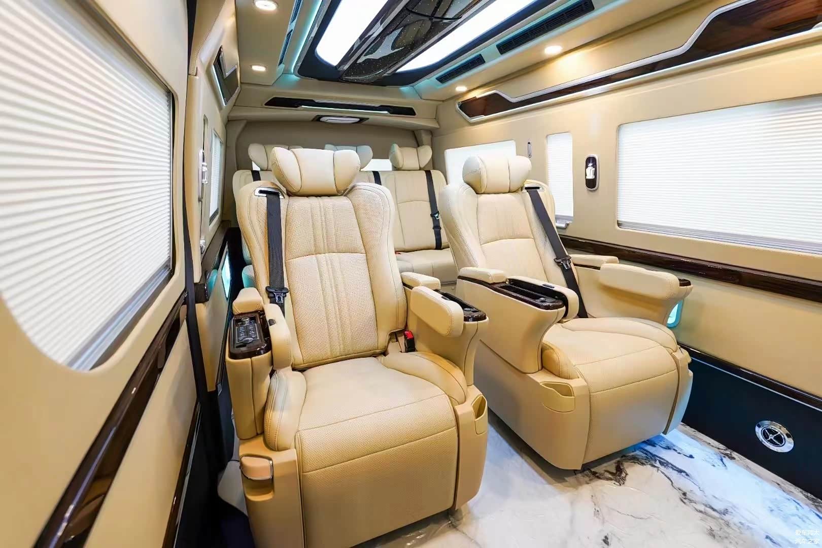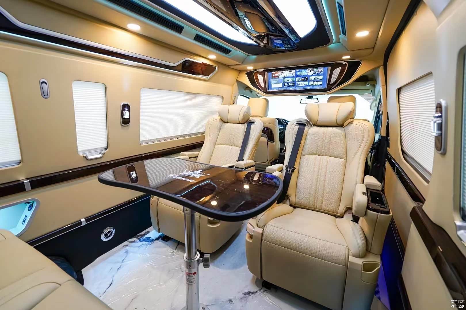 改装方案有很多:升级全车16寸轮毂;全车侧墙和真皮包覆;主副驾驶储物盒;前排中央扶手冰箱;全车手动窗帘;全车整体印花地板;塑料件改色;仪表台包覆;吸顶电视;皇冠版内饰顶灯;全车升级镀铬件。