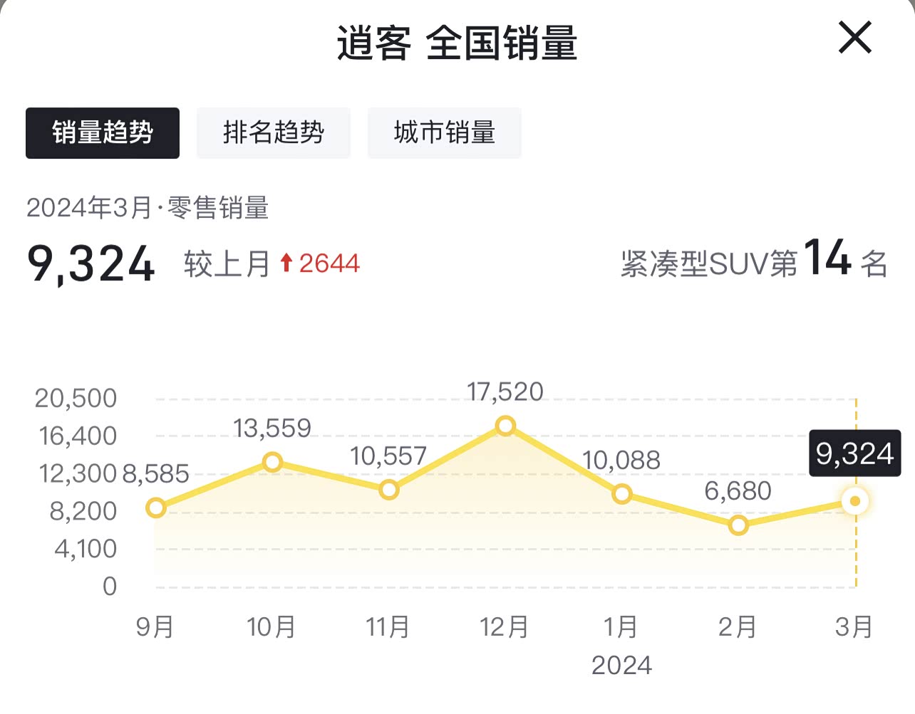 3月份,逍客卖了9324辆,近半年来,平均月销量一直在万台左右,而且目前走量的主要就是逍客经典,1.3T的新逍客销量很一般。那么买了这么久的一个车子,凭啥现在还这么热销呢,原因也很现实,无非就是价格真的降到位了。