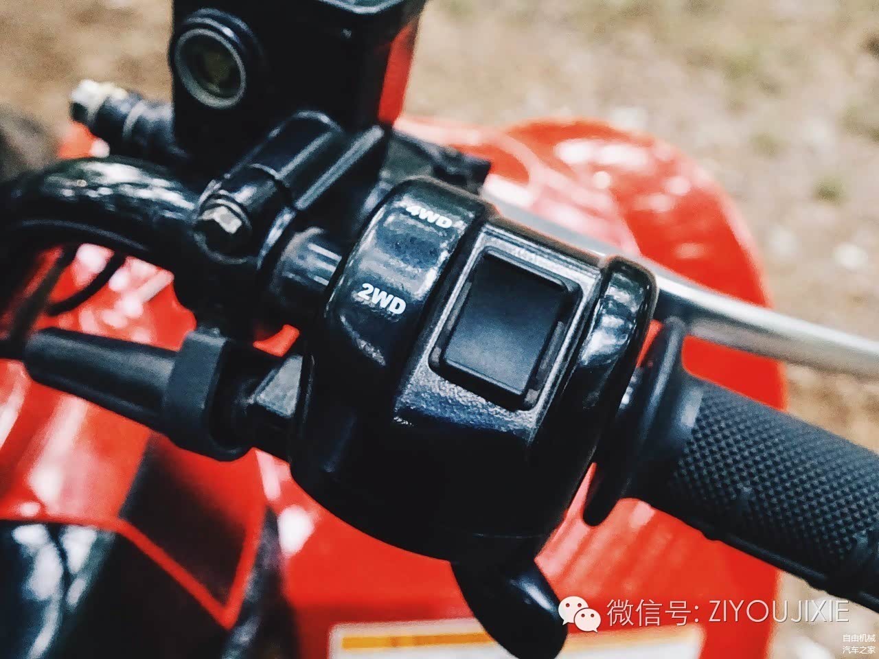 它使用无极变速箱,所以车把上并没有离合器,左右分别是前后刹车,集成了灯光、点火、以及四驱切换按钮。