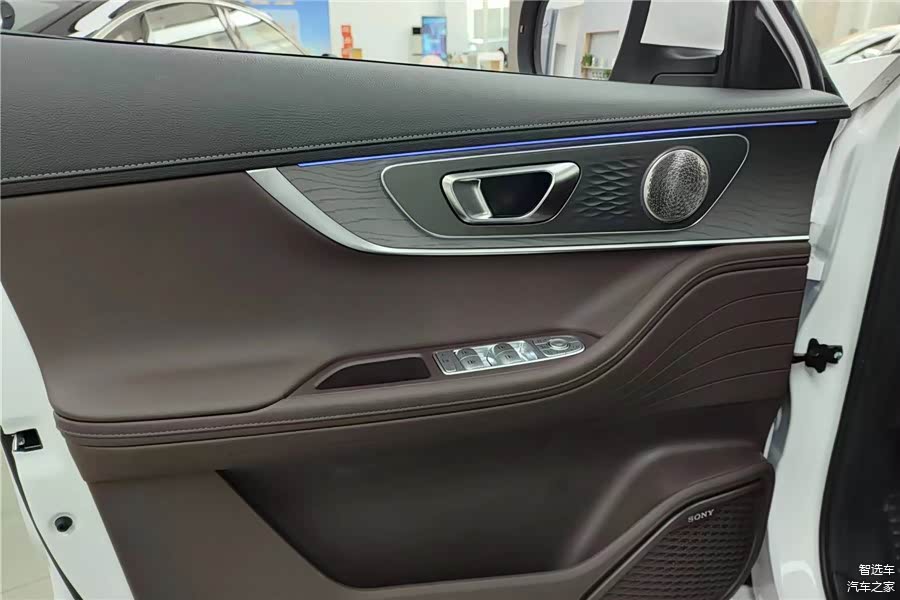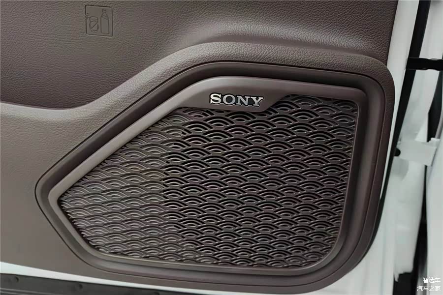 奇瑞瑞虎8 PLUS冠军版的门板内侧也加入了很多银色装饰件,特别是上方的音响罩和车窗升降键,有点某德系豪车的意思。另外,前门板内也有氛围灯,下方的音响罩上还有SONY的logo,质感很不错。
