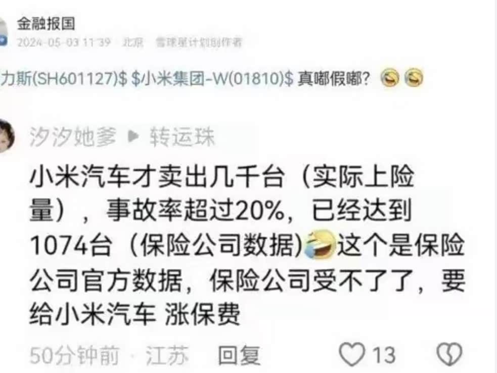 而有保险公司内部人士表示,目前小米汽车才卖出几千台(实际上险量),而事故率却高达20%,达到1074辆。因此导致保险公司备受压力,决心要把小米SU7的保费向上调整。
