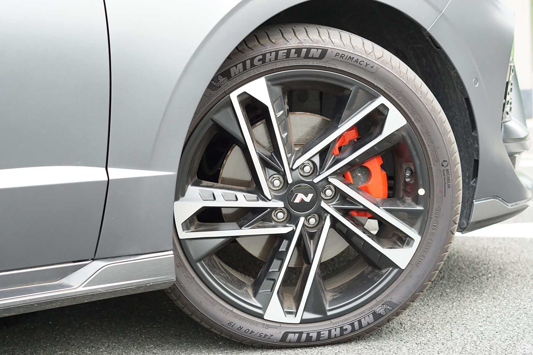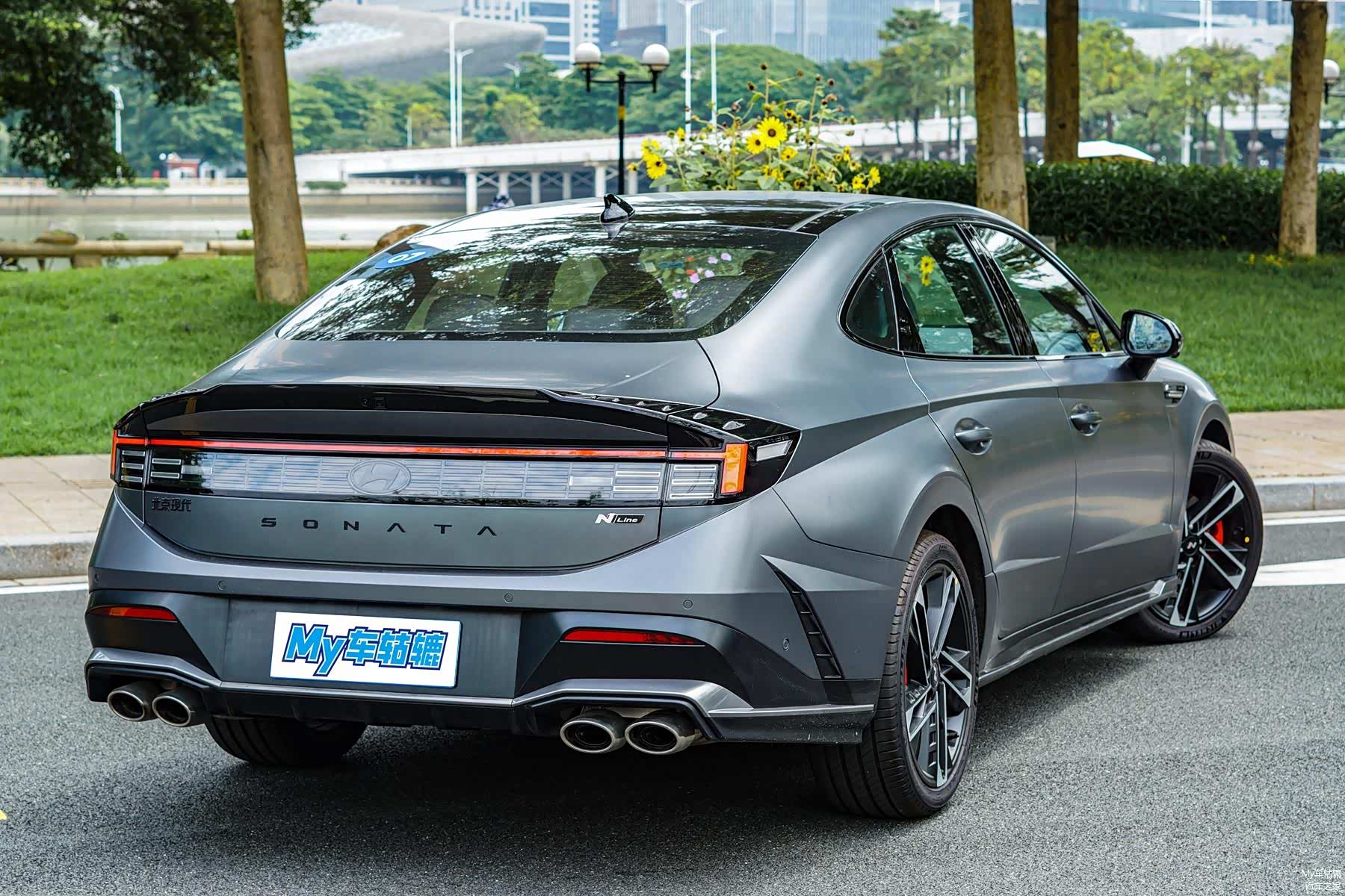 侧面腰线凌厉,熏黑的轮毂搭配红色卡钳增强运动感,尾部新增后扰流板和尾翼,双边四出的排气造型已经在昭示它的性能实力。另外熏黑的LOGO,还有前格栅、后备箱与翼子板处都突出了N Line标识。原厂自带改装,几乎无死角的高颜值造型,令第十一代索纳塔在B级车中非常出众。不得不说,韩系车在设计这块“拿捏得死死的”。