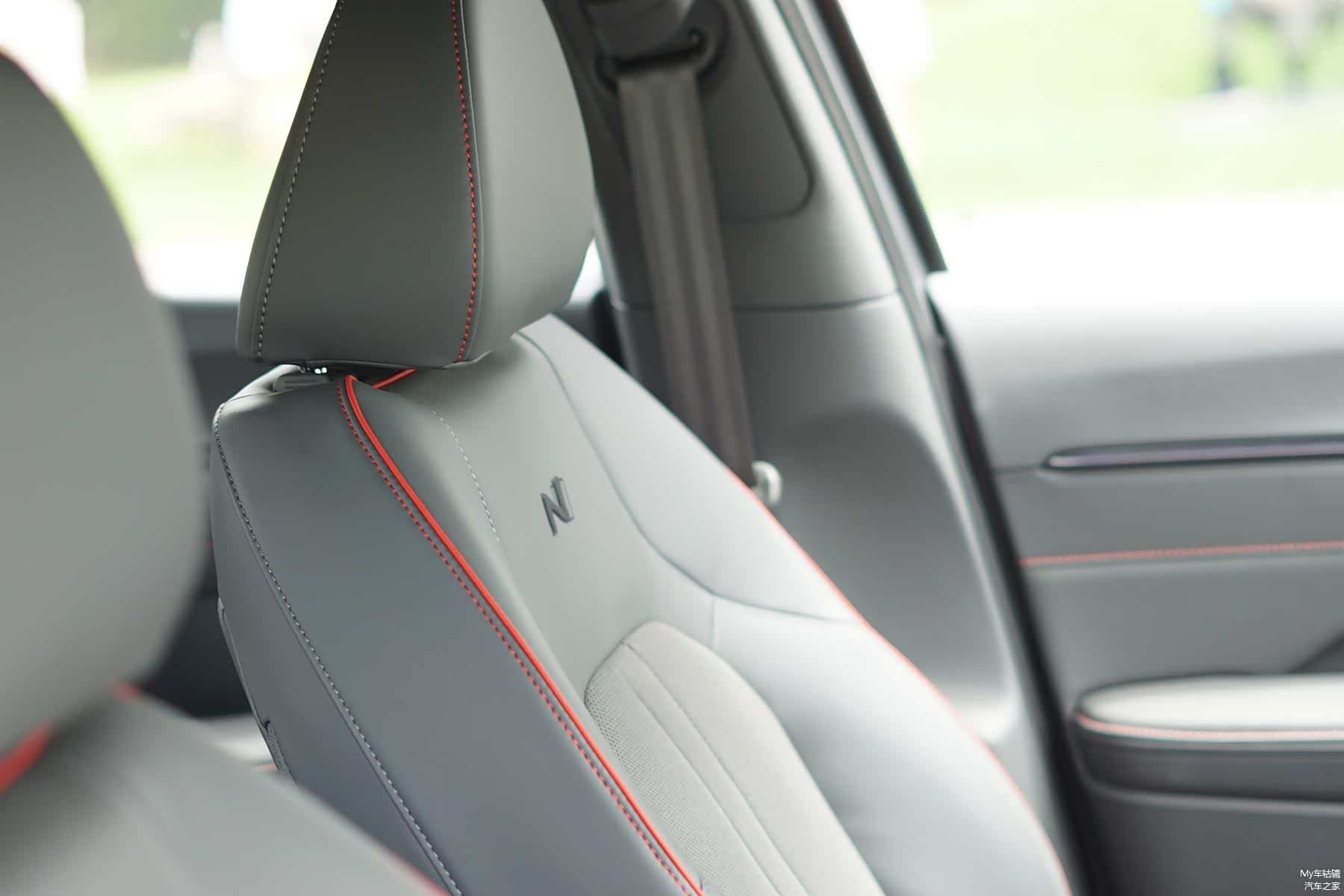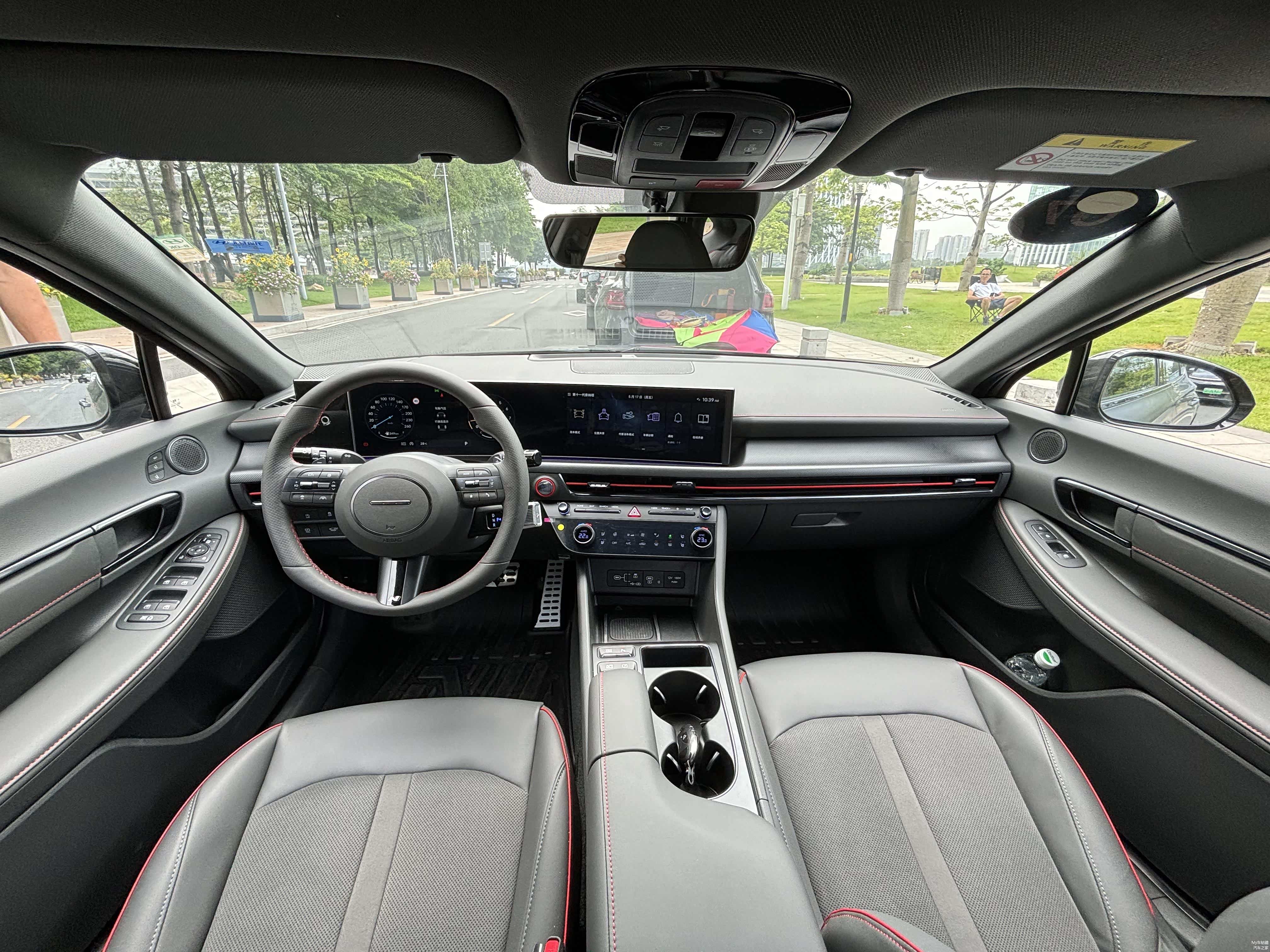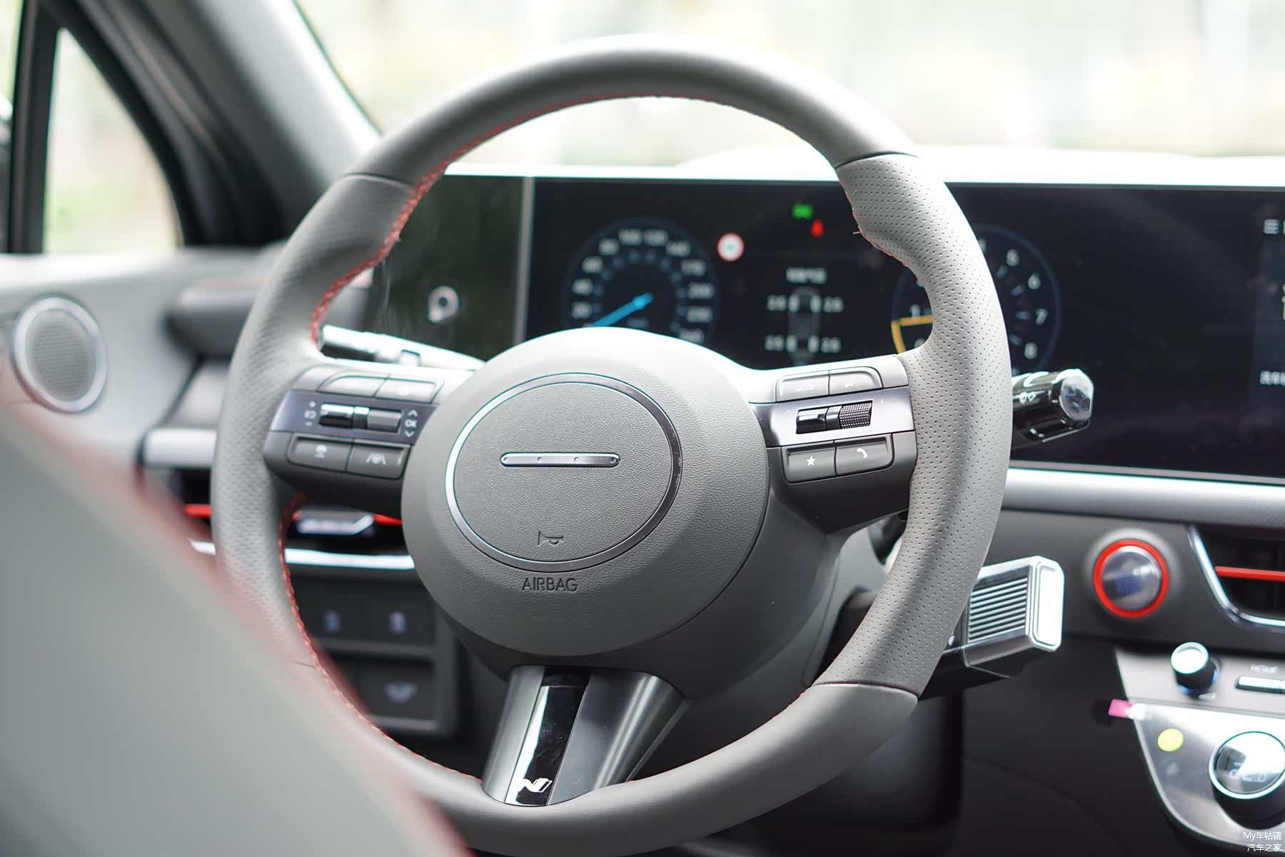 内饰方面也有些变动,这台实拍的N Line版本车型采用的是碳纤维纹理饰板,红色缝线强调运动氛围。全新的三辐式方向盘更好抓握,并且方向盘的LOGO竟然是采用了摩斯密码理念的H,你发现了吗?另外换挡机构变更为旋转式电子怀挡,并且双连屏呈现曲面效果,方便驾驶员操作。空调面板和多媒体控制区域增加旋钮按键,方便开车过程中盲操,人性化的设计值得一个好评。