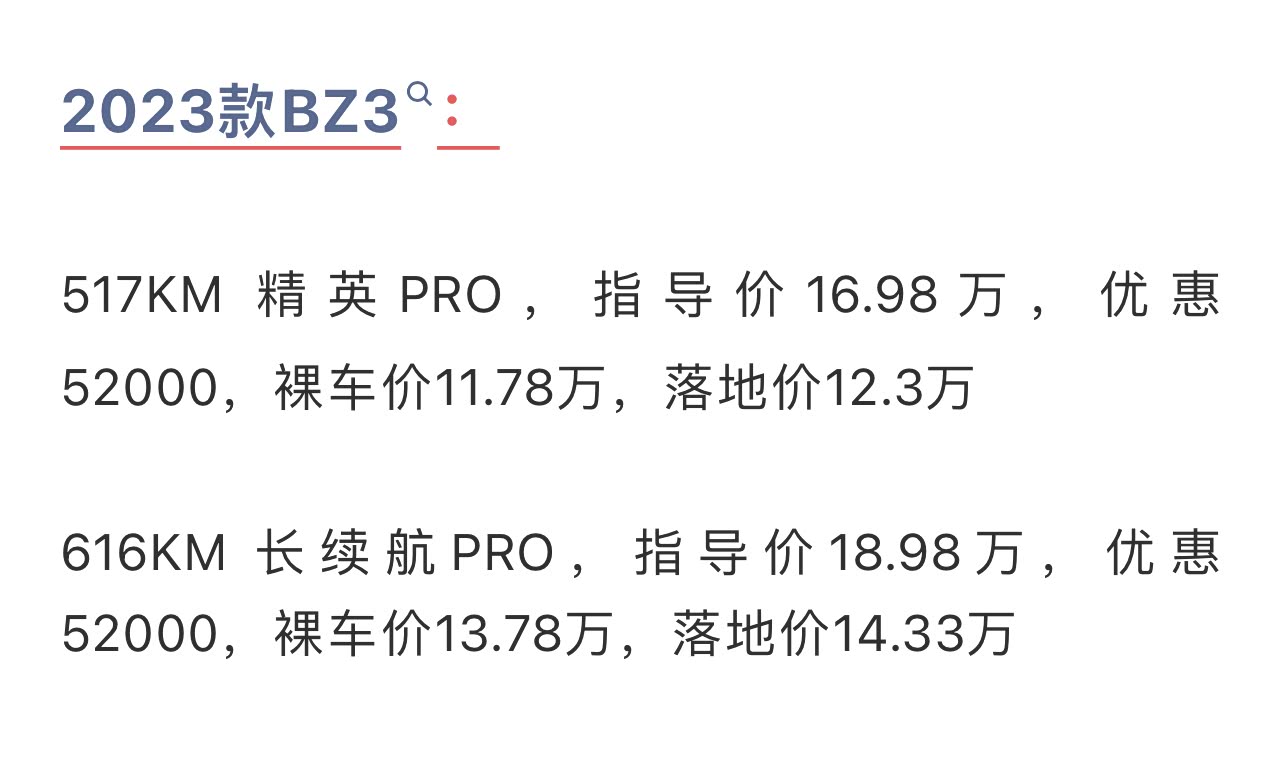 废话不多说,分享一下5月份bZ3的真实行情。517千米续航精英PRO版,指导价16.98万,现在终端能优惠5.2万,裸车都不到11.8万,落地在12.3万上下。616KM长续航PRO版,优惠后实际落地价在14.3万左右。