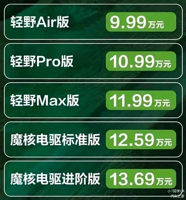 全新北京BJ30提供5款配置车型,包含3款1.5T燃油版车型(1.5T DCT两驱轻野Air版、1.5T DCT两驱轻野Pro版、1.5T DCT两驱轻野Max版);2款1.5T油电混动车型(1.5T DHT魔核电驱标准版、1.5T DHT 4WD 魔核电驱进阶版),售价9.99-13.69万元。