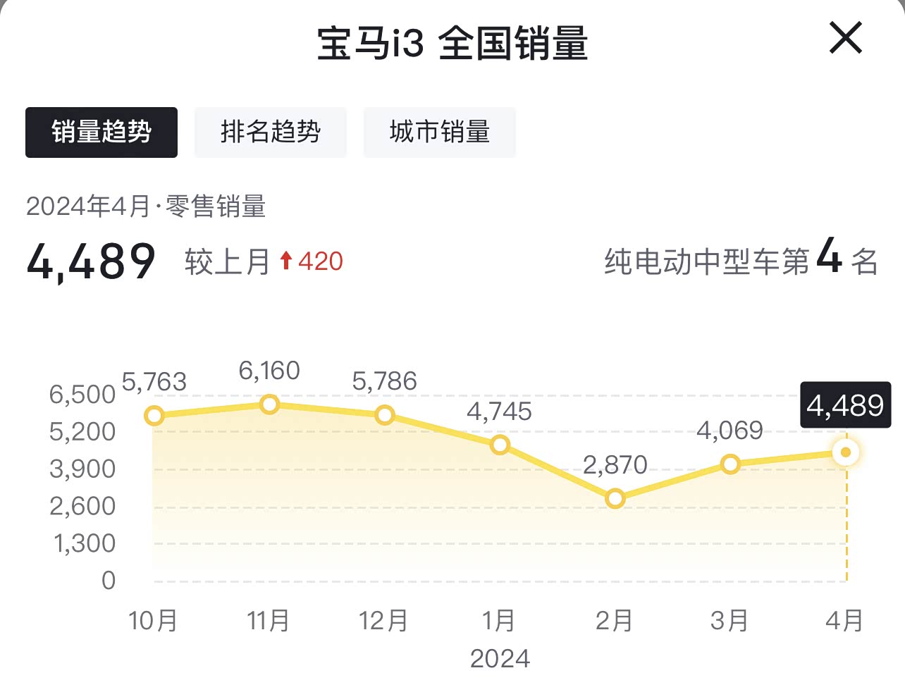 不是危言耸听,宝马“3系”新车现在落地才21万出头。不过这个“3系”是带电的,也就是宝马的i3。价格下来了,宝马i3的销量确实也挺争气的,4月份宝马i3卖了4489辆,这成绩已经相当优秀了,要知道Model 3才卖了5000辆出头,蔚来的ET5、极氪的007、小鹏的P7都不如宝马i3卖得好。