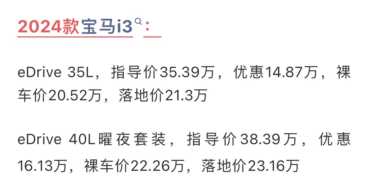 下面就来分享一下,宝马i3在5月份的真实行情。指导价35.39万的35 L入门款现在终端的优惠已经接近15万,裸车也就20.5万左右,电车没有购置税,所以这车加保险的落地价也就21.3万上下。40 L耀夜套装更狠,优惠能达到16万多,全款落地不到23.16万。