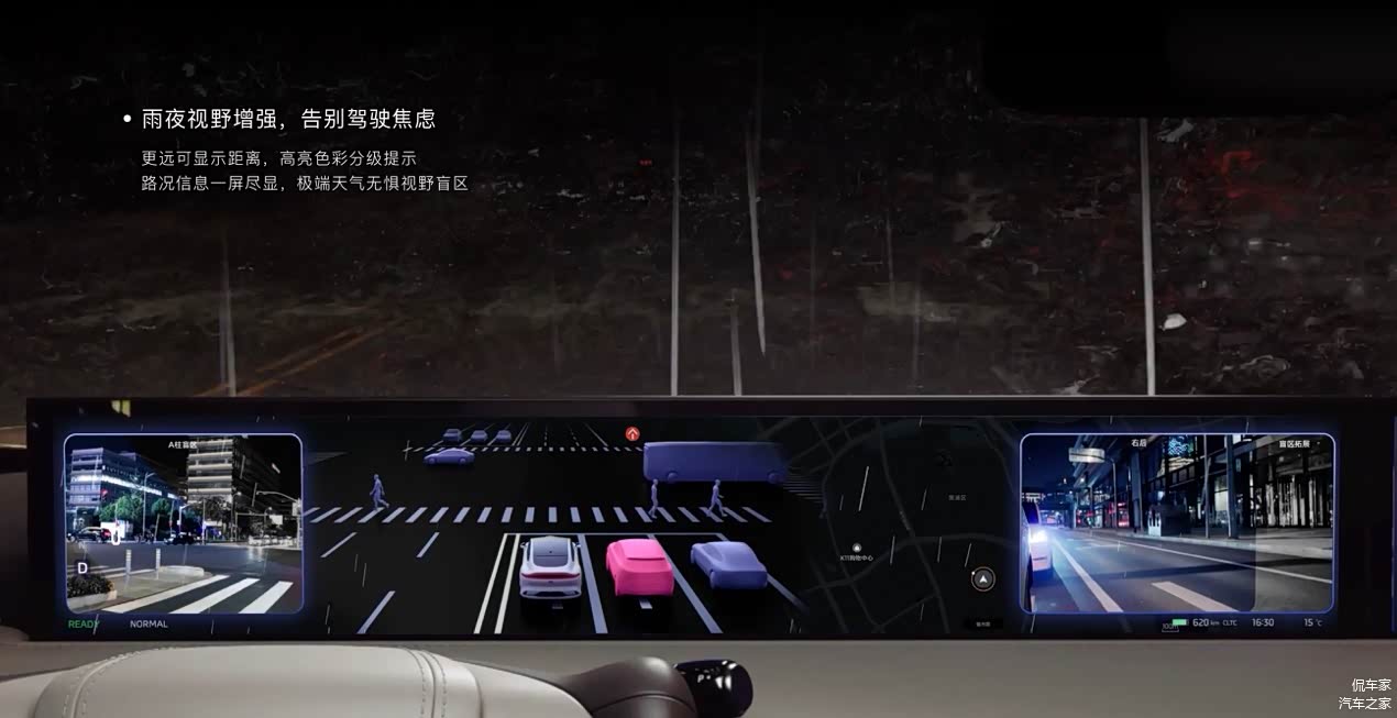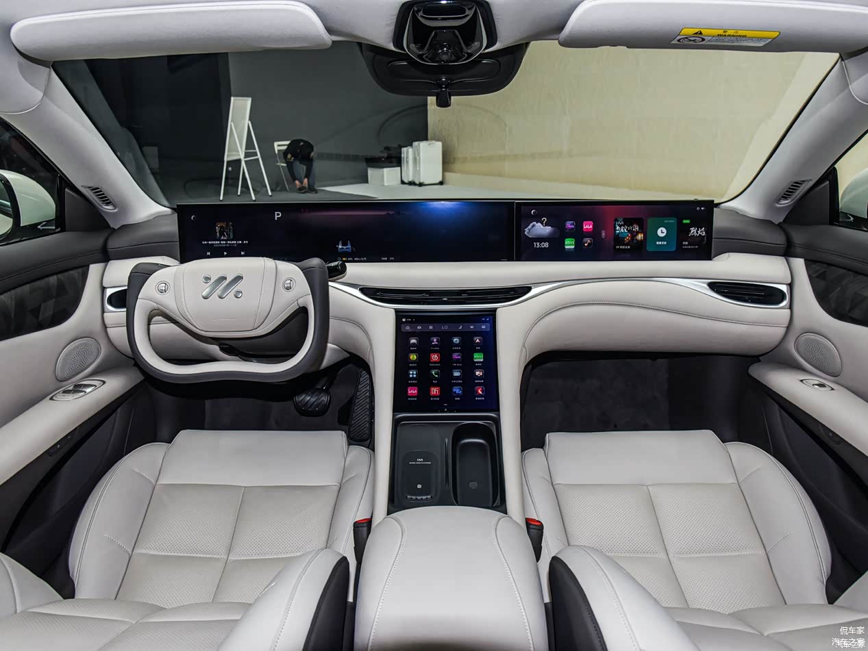 智己L6的车内将质感与科技完美融合。搭载尺寸夸张的26.3英寸连屏以及10.5英寸触控屏,车内的视觉焦点都被大连屏锁定,很极致,现代的科技感直接拉满了。屏幕大的好处那可太多了,采用OMR追光渲染技术,视觉效果非常惊艳,背景光线可随时间和外界光线实时变化,能更好的展现细节。并且配备了雨夜视野增强,可显示更远距离的路况和盲区视野,在天气恶劣的时候能够更好的帮助驾驶员观察路况,对驾驶安全的提升很有帮助。同时可选装YAT巡航型半辐方向盘,这是智己家族最有特点的配置,不仅很有新鲜感,在以后用车时也很有话题性,相信年轻人都会选择尝鲜的。