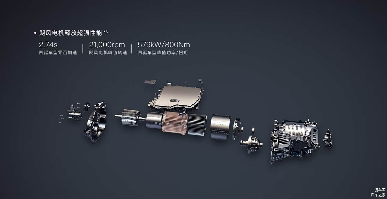 新车将会提供单电机以及双电机的版本,单电机有三种动力,最大功率分别为216kW、248kW和300kW,对应的0-100km/h加速时间分别为5.6秒/4.6秒/4.6秒,对应的续航里程分别为(CLTC)650km、710km和850km;双电机版最大功率579kW,峰值扭矩800N·m,0-100km/h加速时间2.74秒,性能相当劲爆。