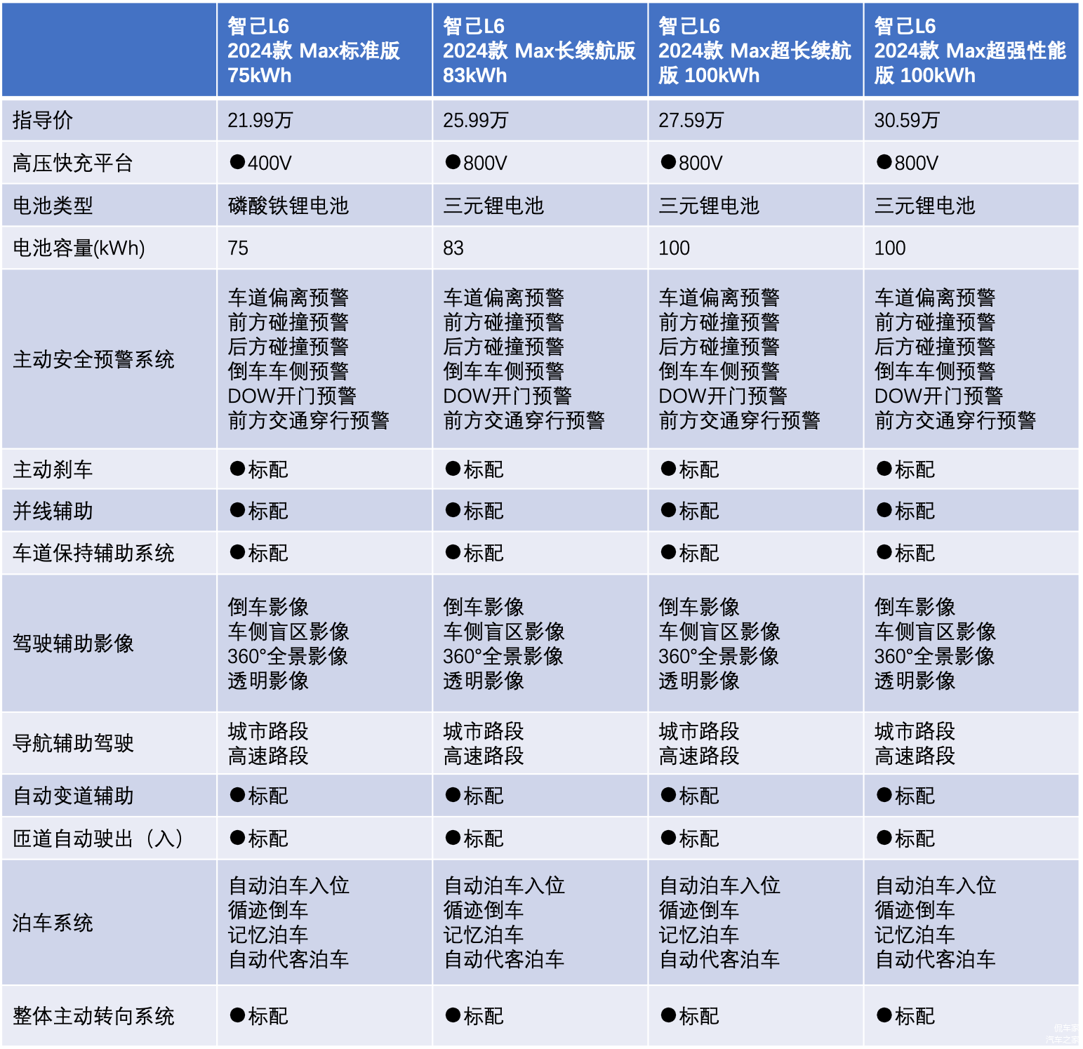 智己L6在全系标配方面相当的厚道,像主被动安全配置、智驾系统、智能硬件、辅助系统、车内舒适性功能等等各方面都做到了全系配备,差异化主要集中在电池容量、性能以及续航方面,各位做选择主要也是看这方面的需求。