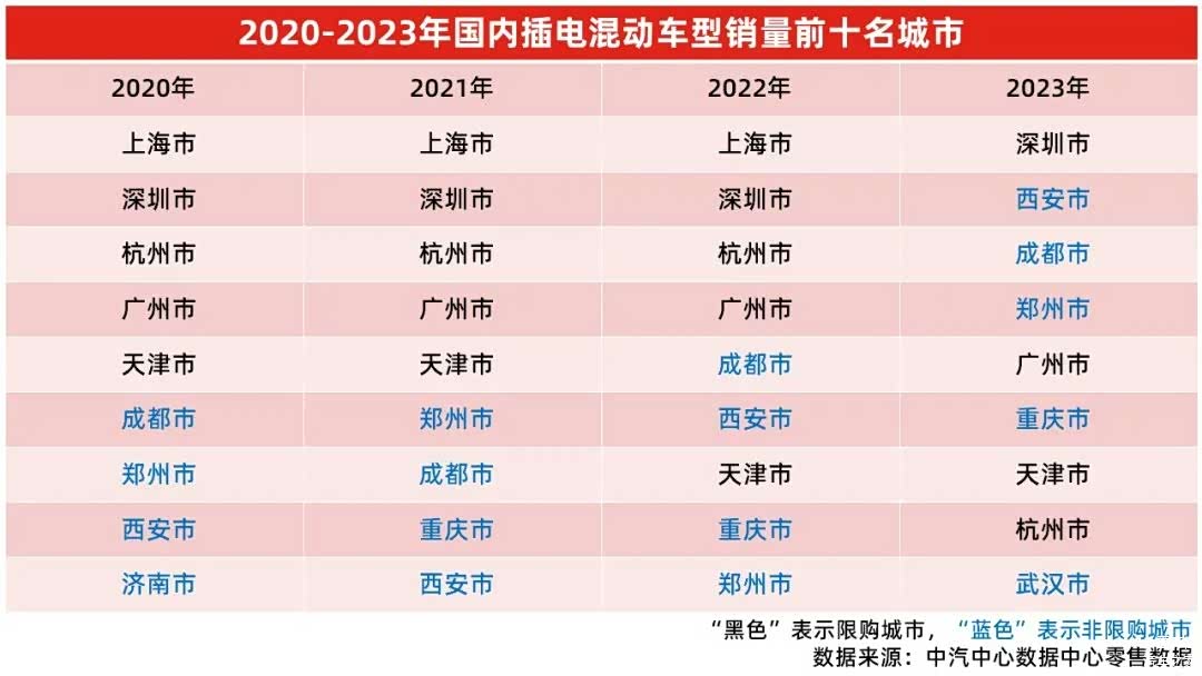这意味着整个插电混动市场的重心,正在向下转移。2023年,插电混动销量前十名的城市,一改前些年限购城市排名前列的格局,充分证明产品力对消费需求的满足,正在取代政策,成为插电混动规模扩张的核心驱动力。