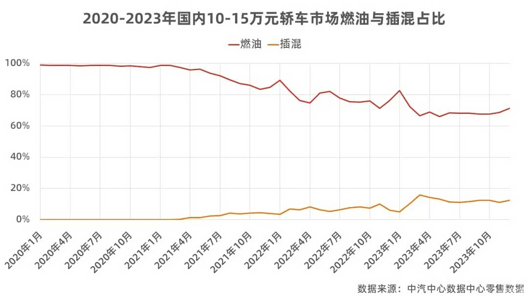 但如果具体到海豹06DM-i所处的10-15万元轿车市场,插电混动仍然有着巨大的上升空间。虽然2021年第四代DM技术车型上市后,比亚迪几乎以一己之力将插电混动在10-15万元轿车市场的占比提升到超过10%,但合资燃油车在这个细分市场还有很强的惯性。