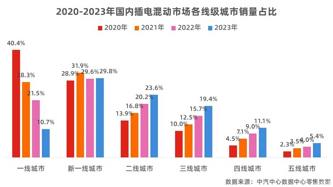 从近几年国内插电混动市场的结构变化,我们就可见一斑。2020年,一线城市占全国插电混动销量的比例超过四成,但到了2023年,这一比例仅剩下10%。相反,二线及以下城市在全国插电混动销量中的占比,以几乎每年提升10个百分点的速度,从2020年的30.6%提升到了2023年的59.5%。
