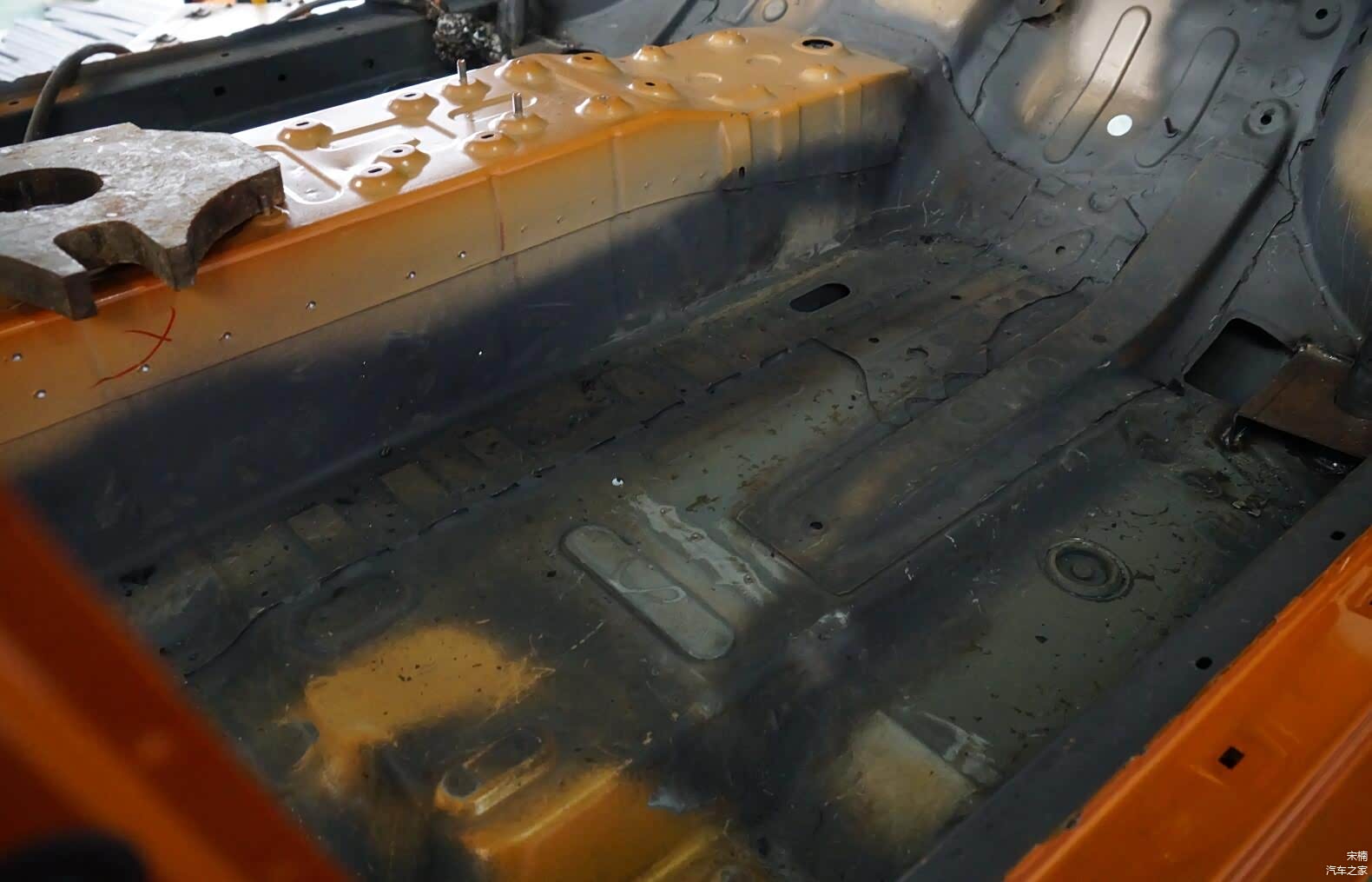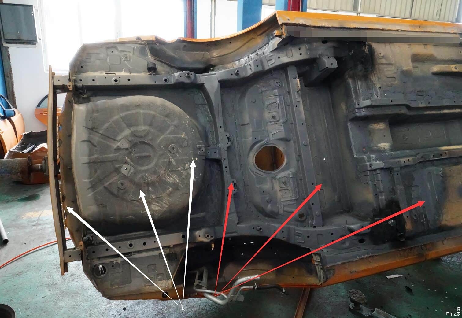 如上图所示,白色箭头所指原厂状态秦100的后备厢(车身焊接)部分,没有进行任何补焊。红色箭头所指车身焊接的驾驶舱部分,对后排座椅焊接件、纵梁以及地板进行了全面补焊。这种有选择的补焊唯一目的就是保留吸能溃缩区同时,满足提升整车刚性和驾驶员安全性。