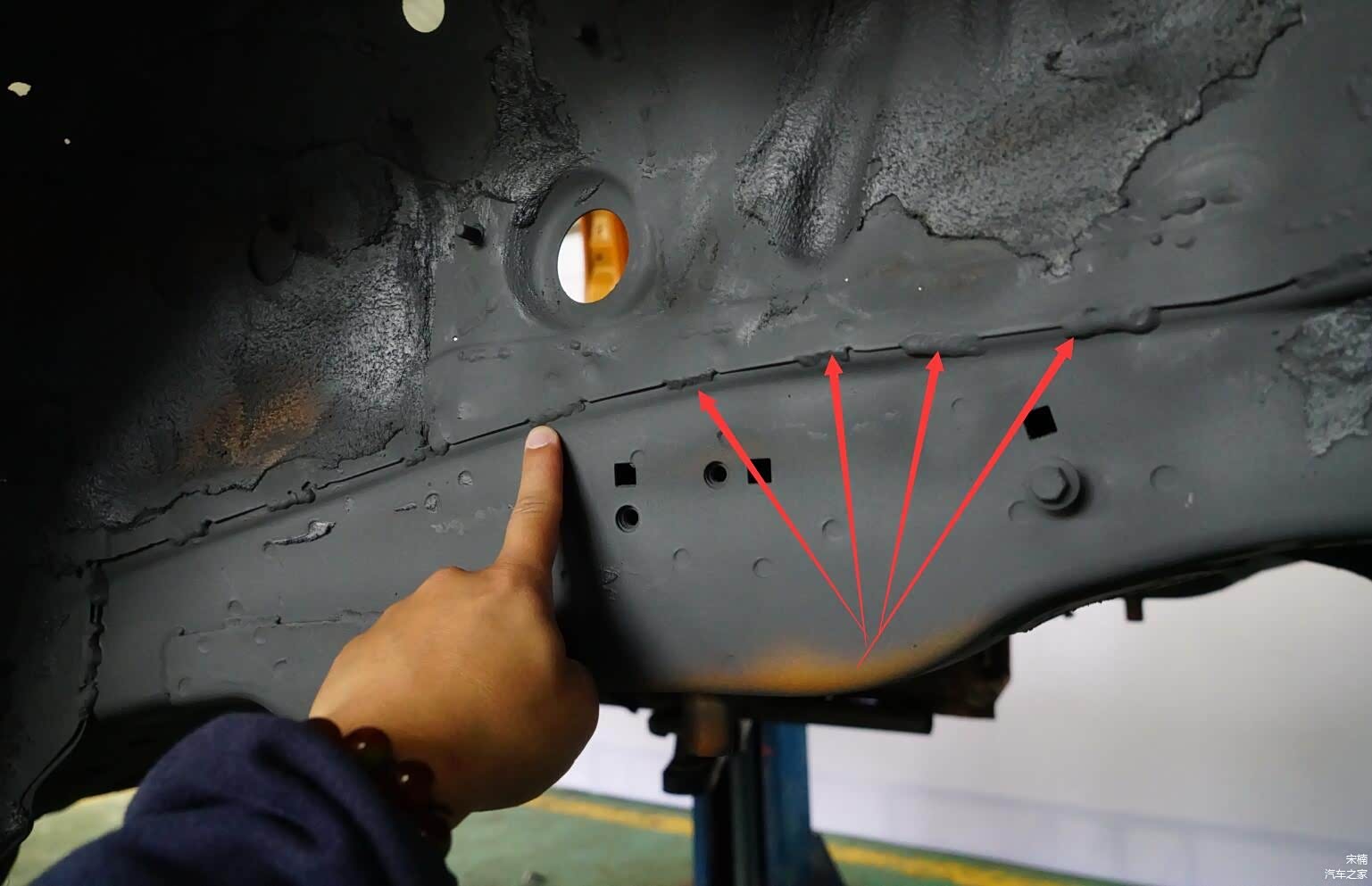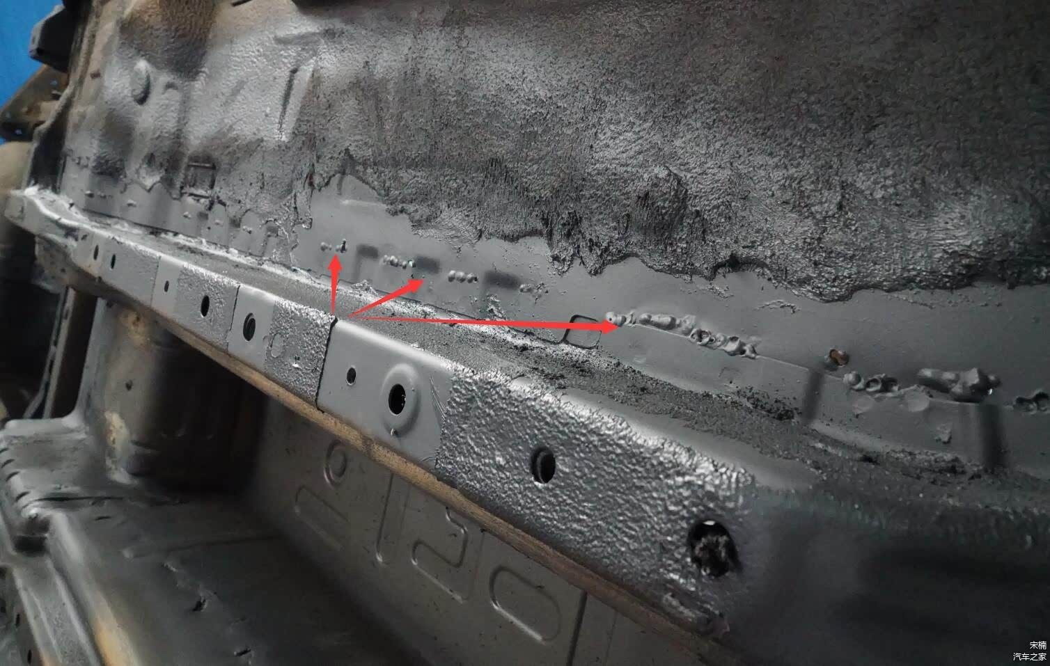 上图为秦100车身焊接前后地板与纵梁之间补焊特写(红色箭头)。原本车身焊接底部敷设大面积降噪防腐涂层。为了保证补焊之后车身强度的提升,必须要彻底清除这些涂层。
