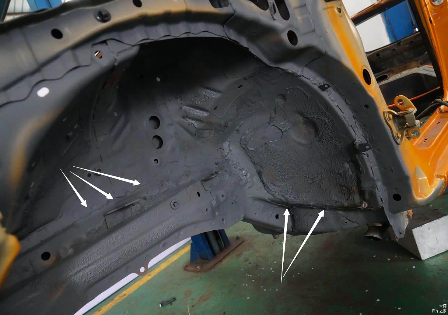 黄色箭头:秦100动力舱的左前轮室罩(焊接件)进行了大面积补焊并喷涂防腐涂层状态。