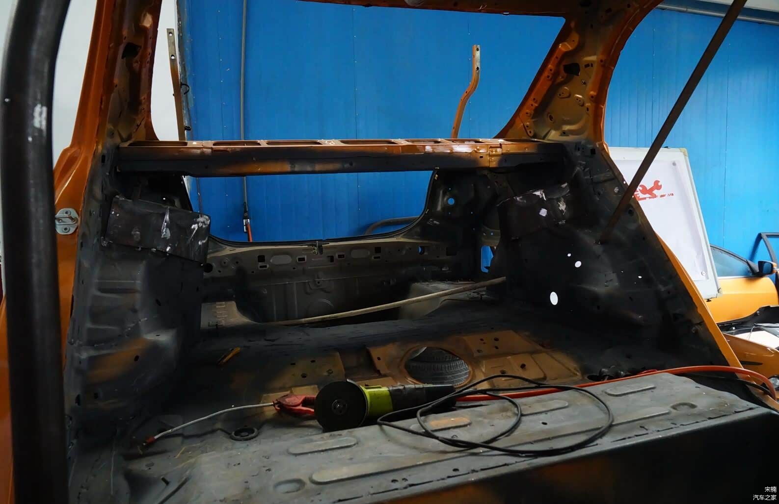 秦100赛车在拆除所有分系统之后,还要对车身焊接的地板加强梁、C柱内板、门槛内板等非必要存在的焊接件拆除。