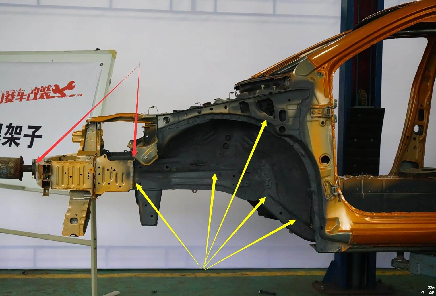 黄色箭头:刚度更高的管架用于基础结构,在碰撞时保证不会断裂。