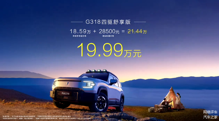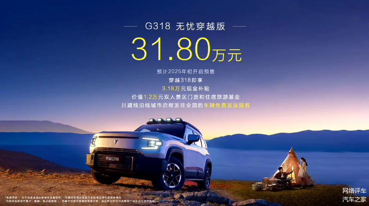 除了今日上市的版本外,深蓝 G318 还推出一款无忧穿越版,售价 31.8 万元,预计 2025 年初开启预售;G318 两驱标准版 17.59 万元,将于今年 8 月交付,现已开启预售。