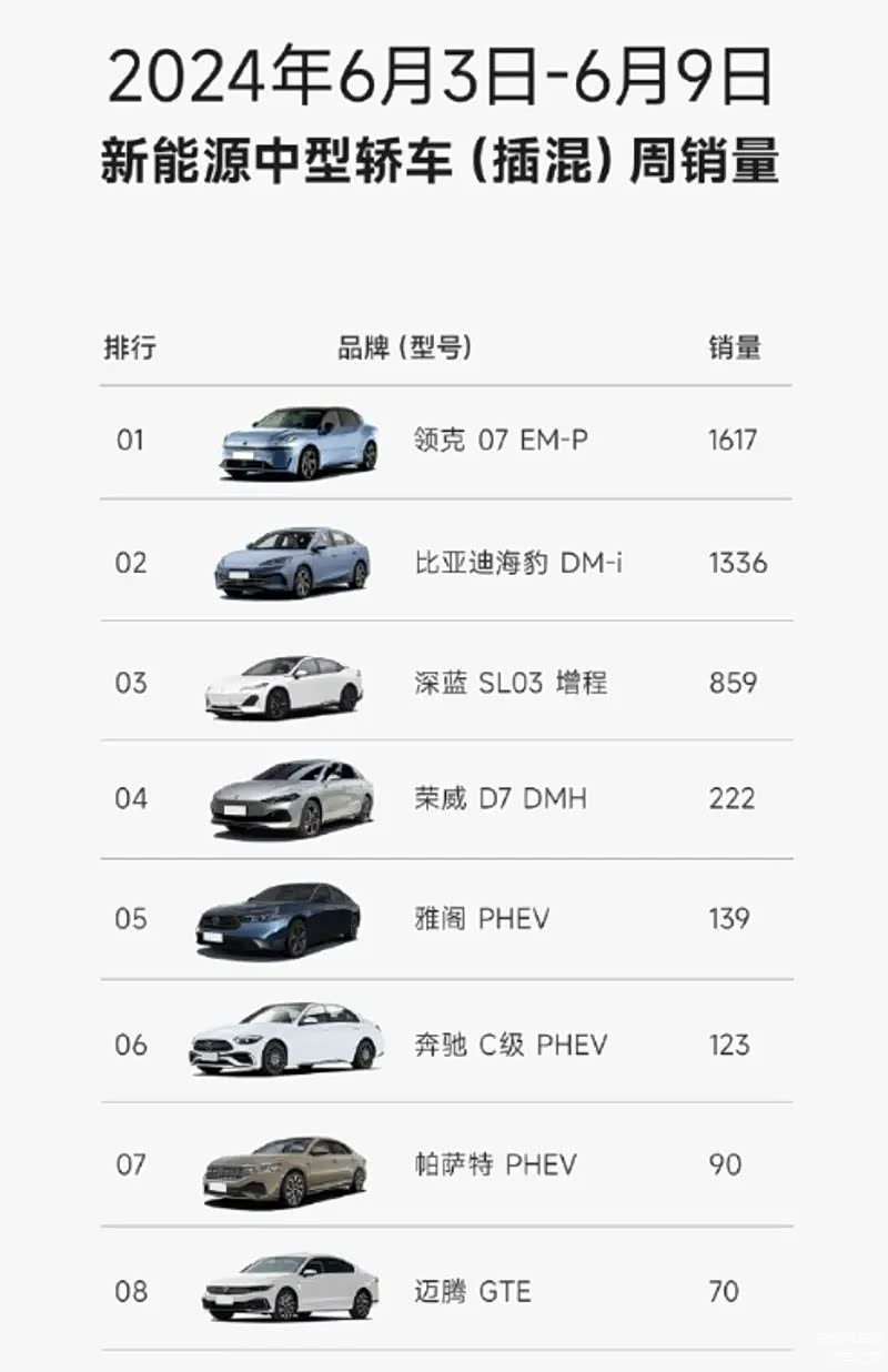 插混类新能源中型轿车是当下汽车市场竞争最激烈的领域,那么谁能在这个领域笑傲群雄呢?快看看6月第一周的数据吧:领克 07 EM-P以1617辆的销量,成为新能源中型轿车(插混)榜单冠军!
