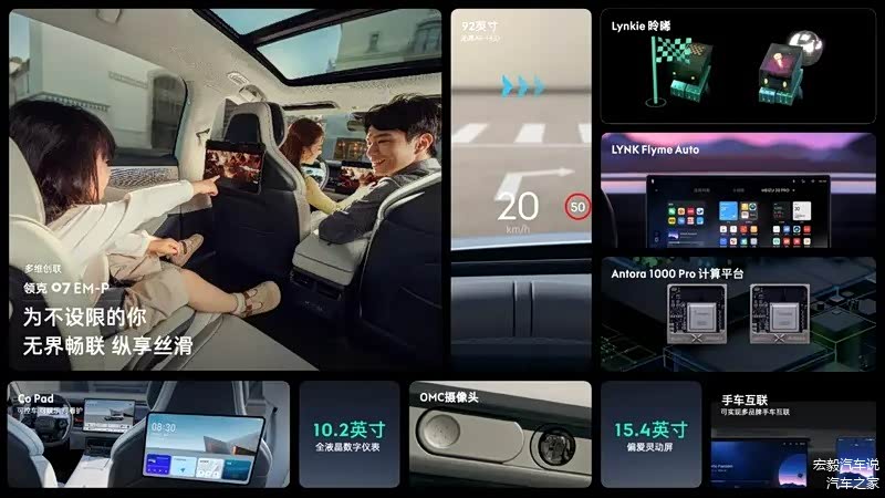 作为主打家庭用车的领克 07 EM-P,在智能配置方面也是毫不含糊。领克07 EM-P是首款在20万以内实现““3+2+1”多屏畅联的车型,不同终端系统可实现多生态无感连接,支持中控屏、全液晶数字仪表、AR-HUD、后排Co Pad、手机多屏联动,信息与指令在各屏间无缝流转。自己看导航、妻子追剧、孩子看动画……这就是一台“全家影院”的超级神车!