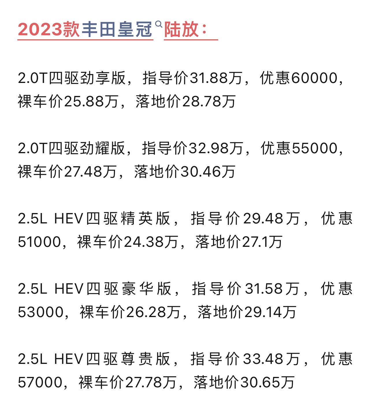 作为丰田汉兰达的换壳车,前脸还有更高级的皇冠LOGO加持,皇冠陆放这车还是有很多粉丝的。如果近期你也打算入手这车,按照这个优惠去谈,你绝对不会买贵,而且我说的这个价格,你也一定可以买到。目前2.0T燃油版的皇冠陆放能下5.5万~6万,像是官方指导价31.88万劲享版,落地在28.78万左右。劲耀版优惠后裸车约27.5万,落地在30.5万上下。2.5升双擎版,优惠在5.1~5.7万,豪华版落地约29.14万,尊贵版落地在30.65万上下。目前双擎的四驱尊贵版,相对来说最为畅销。